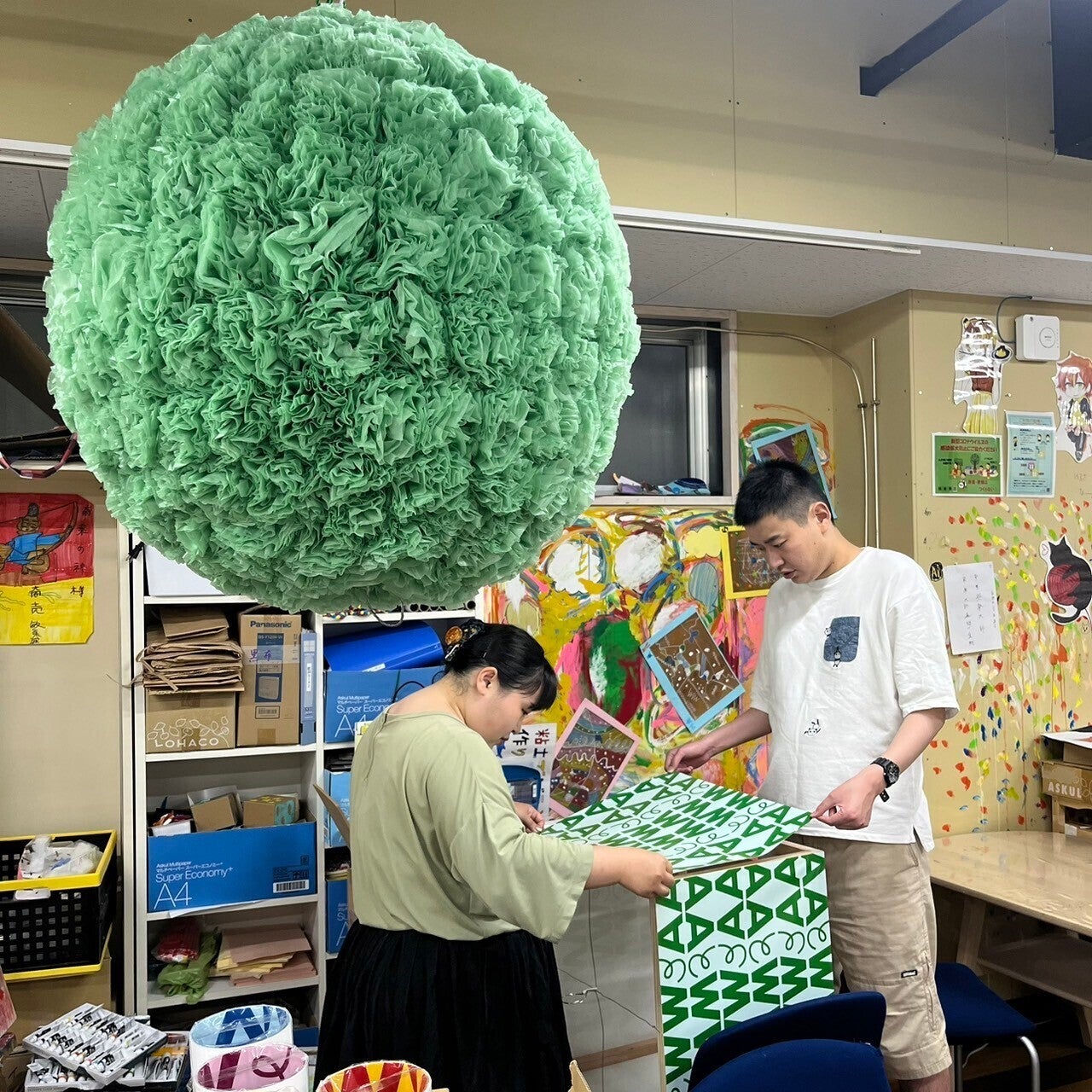 昨日の夜、搬出作業を行いまして、今日はいつもの一番町に戻りました。妙に寂しいです。今朝の一番町、祭りのあとだからか急に寂しさを感じます。お披露目を終え、Aiファクトリーに帰ってきた七夕飾り。ダクトレールに吊るしています。さみしい、、ずっと飾って置けたらいいのに!私たちが一番町に移転してきて6年半ほどになりますが、アートとまちづくりをテーマに活動している私たちにとってアーケードの大きな七夕飾りは毎年検討しては諦め続けてきた大きな目標であり憧れでした。こんなに良い活動なのだから取れるはず!と制作スケジュールの関係から助成金の結果を待たずして七夕制作を決行したものの、助成金にまんまと落ちてしまい、費用をどうにかまかなうためのクラウドファウンディングを勢いで立ち上げました。短い期間で嵐のように各所へお願いして回りながらお花をとにかくとにかく作り続けて。しかしながらしっかりとした準備を行なっていない急造のクラウドファンディングで広くご支援を募ることの難しいさを日々痛感していました。でもやることは変わらないのでやっぱりみんなで花を作って作って、、そうして出来上がった七夕飾りはびっくりするほど鮮やかで可愛らしくてみた瞬間、目が覚める様でした。前はハイキュー!! うしろは金賞の吹き流しに挟まれるという状況でしたが、欲目ではないと思うのですが、全然引けをとっているようには見えませんでした。商店街の他店の方々からもお褒めの言葉をいただいたり、一緒に作業をしてくれたご家族の皆さんも出来上がった飾りを見てとても喜んでくれ、スタッフの皆とは七夕飾りの下で記念写真を撮ってこの夏の大切な思い出を作ることが出来ました。たくさんの方々が応援してくれ、更にたくさんの方々がわたしたちの七夕飾りを楽しんでくれました。目的の5つ目に挙げていた障がいのあるひと、ない人とが混ざり合って何かをすることで得られる可能性の提示を十分にすることができたのではないかと思います。赤い吹き流しの真ん中、ドットの作品を描いたKASUMIさん「竹林」、「うちゅうシリーズ」2作品の作者 Saikoさん飾りを見にきてくれた「イモムシ」の作家 竹内聖太郎さん七夕飾りを撮影しにきてくれたワンダーアート代表の髙橋雅子さん東北放送の「みやぎ・ひるまでウォッチン!」に出演した時の様子生中継が開所時間と被ったので、通所してきた順にちょっとずつ画角に入り込むAiスタッフたち東北放送さんの「みやぎ・ひるまでウォッチン!」では七夕飾りの掲出に初挑戦する団体として私たちを紹介していただきました。生中継、吹き流しの真下で!!中継の中で、飾りの掲出にあたって七夕の歴史や飾りの制作方法など様々なことをご教示いただきました鳴海屋紙商事さんのインタビューが流れました。”最初は覚悟があるのかと尋ねた。作ってみないとわからない難しさや苦悩があるから。そしたら「腹を括ったので」と返答が来たので。今年体験して他の飾りを見て悔しい思いもしたかもしれない、それを来年に生かして欲しい”ざっくりこんな感じの内容だったと思うのですが、私はもう途中からぐわーっと目の周りに熱が集中して、何かが溢れそうになるのを堪えていました。AとWの活動を3年行なってきてクリエーターたちを信頼していますし、作品の魅力も知っているので、いい七夕飾りができる確信はありました。しかし、お金が集まらなかったら赤字になる。赤字で皆にかけてしまう迷惑だとかストレスに”すごく可愛い七夕飾りができたという事実”が勝ることができるだろうか。初心者が短いスケジュールでどれだけのクオリティが出せるのだろうか。二つの不安が常に頭の中に浮かんでいました。でも考えても仕方ないので、とにかく毎日活動して、それを皆さんにお伝えして、それを繰り返す。それだけに集中して忘れようとしていたのかもしれません。2つ目のスケジュールとクオリティの問題はスタッフたちの頑張りや順応もあってクリアすることができましたが、1つ目のお金の問題からは逃げられません。だから「腹を括った」という言葉を口にした時のことを思い出して、込み上げてしまったのかもしれません。激励のお言葉を受けて最後「来年はどうしますか?」という質問にはそんな気持ちがぐるぐるとしていたので「持続的な活動ができる形を探りたい」と答えたのでした。その後、鳴海屋紙商事さんからは薬玉について「初心者がやった様にはまるで見えない。単純な作りのものからお願いすることができると思う。オフシーズンにさらに技術を伝えればもっと難しいものも作れる様になると思う」とお墨付きをいただきました!今回の七夕飾り制作の目的の一つであった仙台七夕の作り手不足解消と障害のある人の工賃向上を同時に解消する一手となる道が拓けました!飾り作りのお仕事については今後もレポートを続けていきたいと思います。そして、立派に完成して七夕の期間