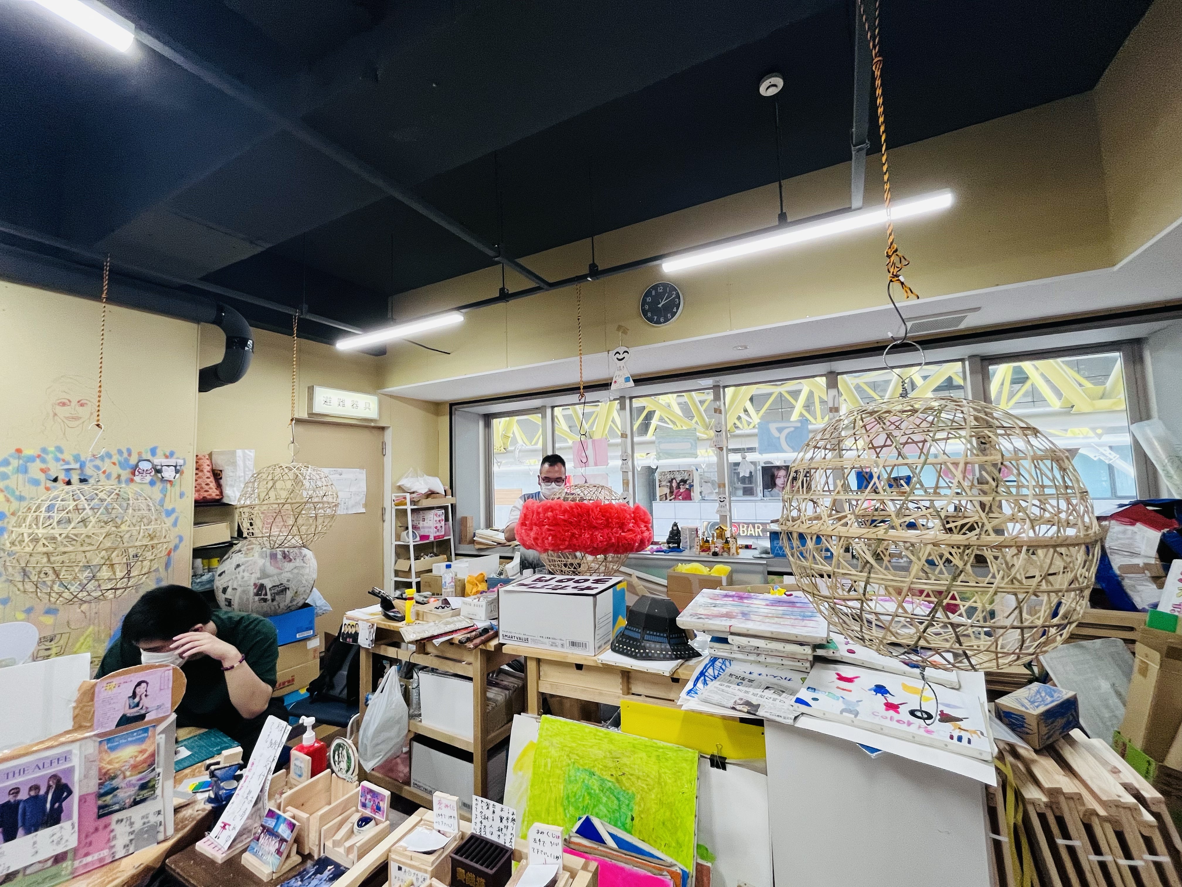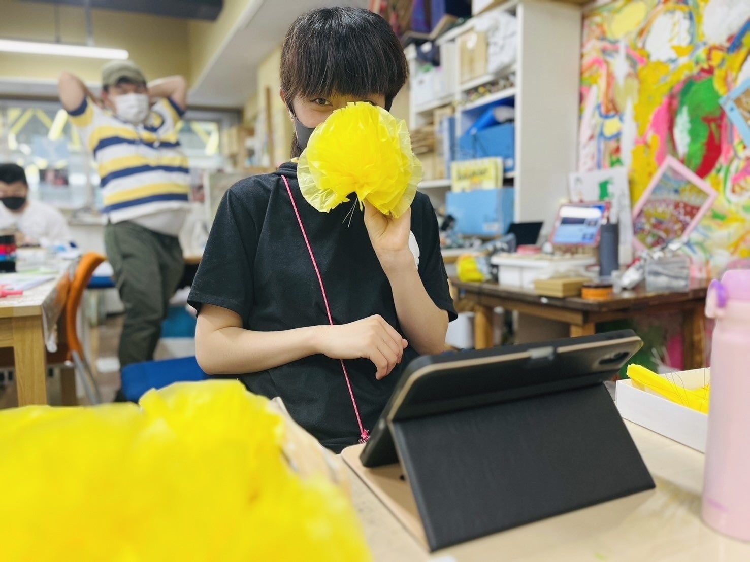 お花を潰さない様に天井からくす玉を吊り下げて作業しています。