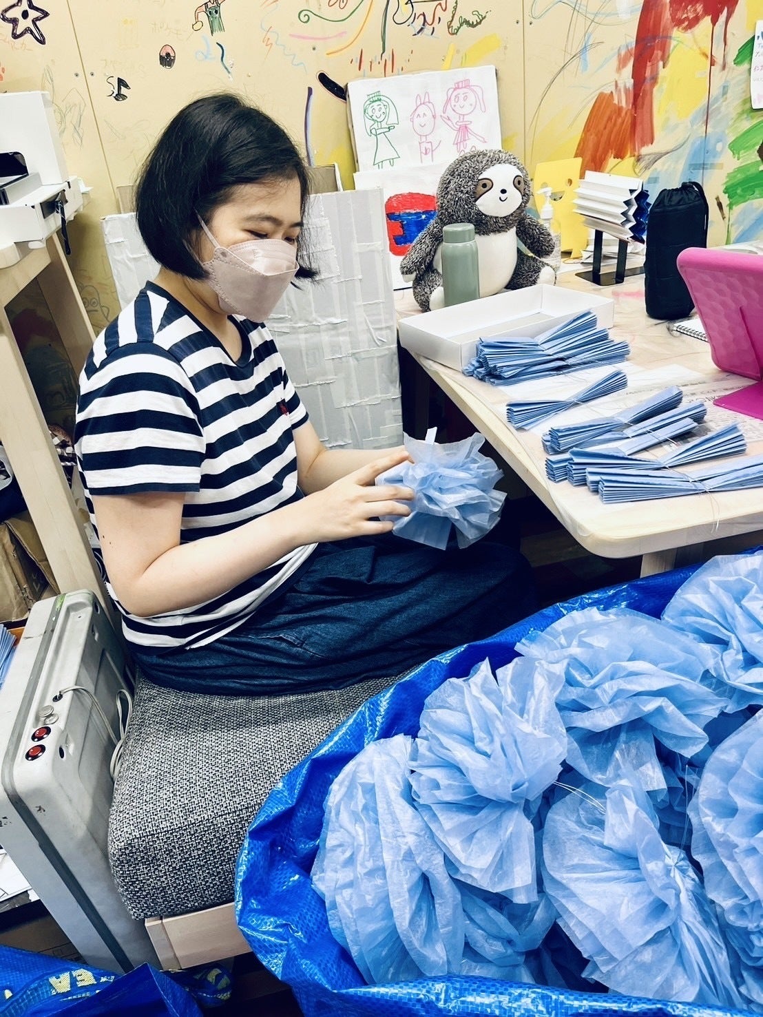 黄色、紫、赤色の薬玉用お花を作り終えて青色のお花を今は絶賛量産中です。