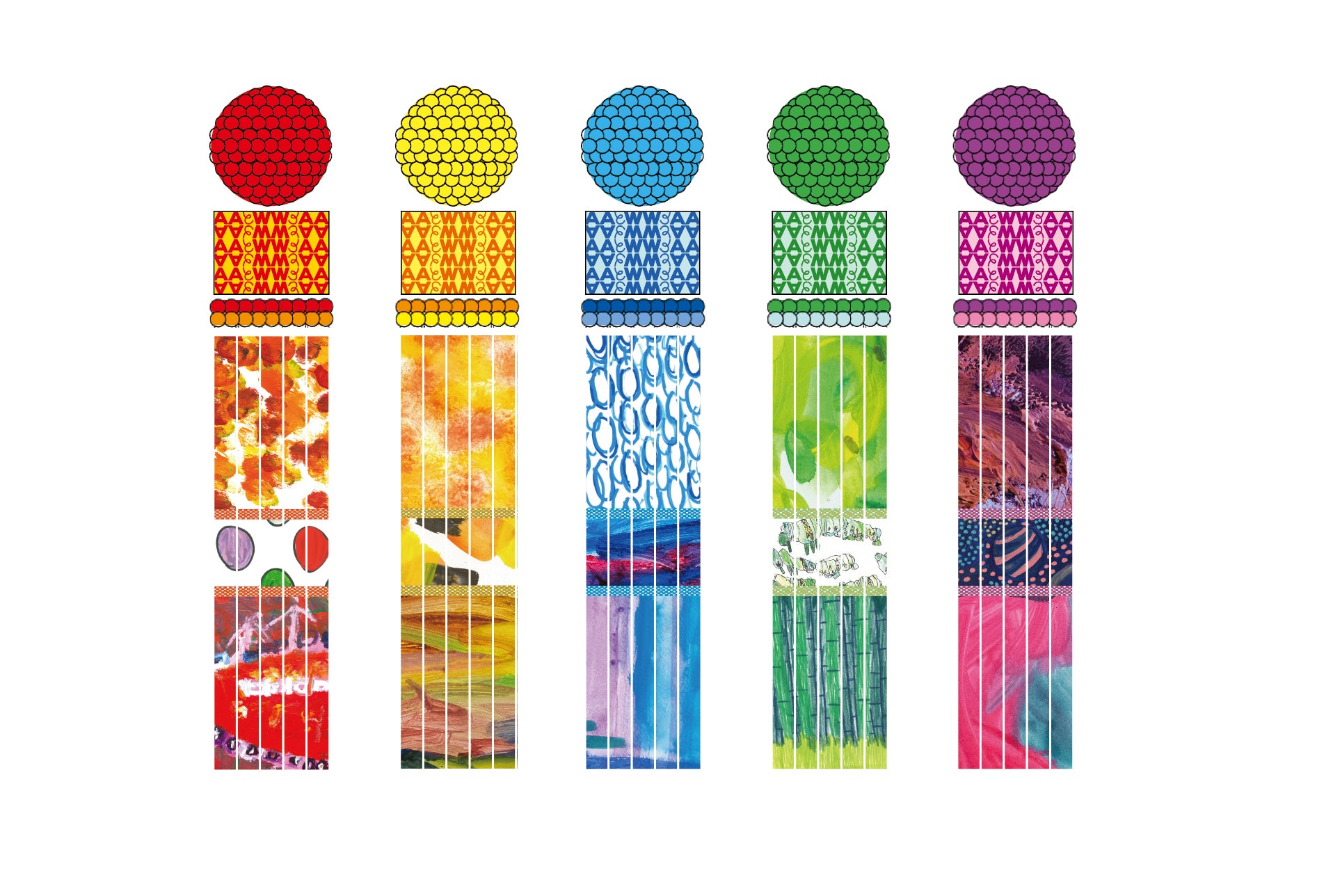 AとWのロゴをパターンにしたものが各5色、薬玉と吹き流しを彩りで繋いでくれています。アルファベットとひらがな、曲線と直線、有機的なものと無機的なもの、和と洋。