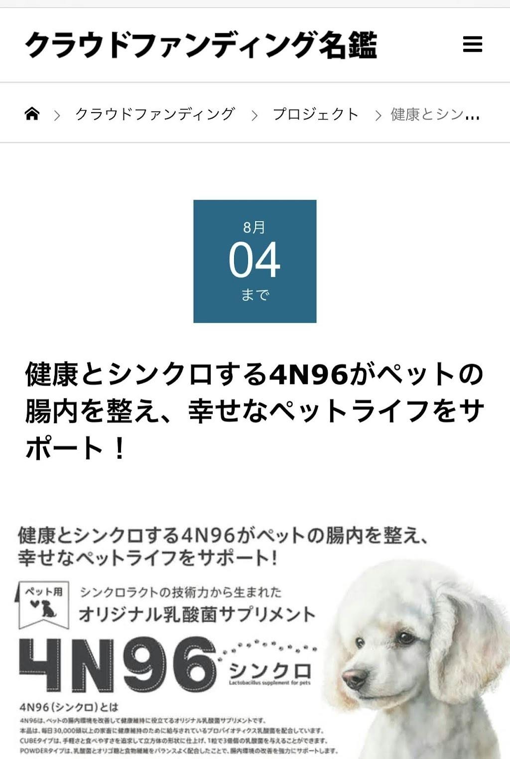 ペット用乳酸菌サプリメント「4N96」クラウドファンディング名鑑はこちら→