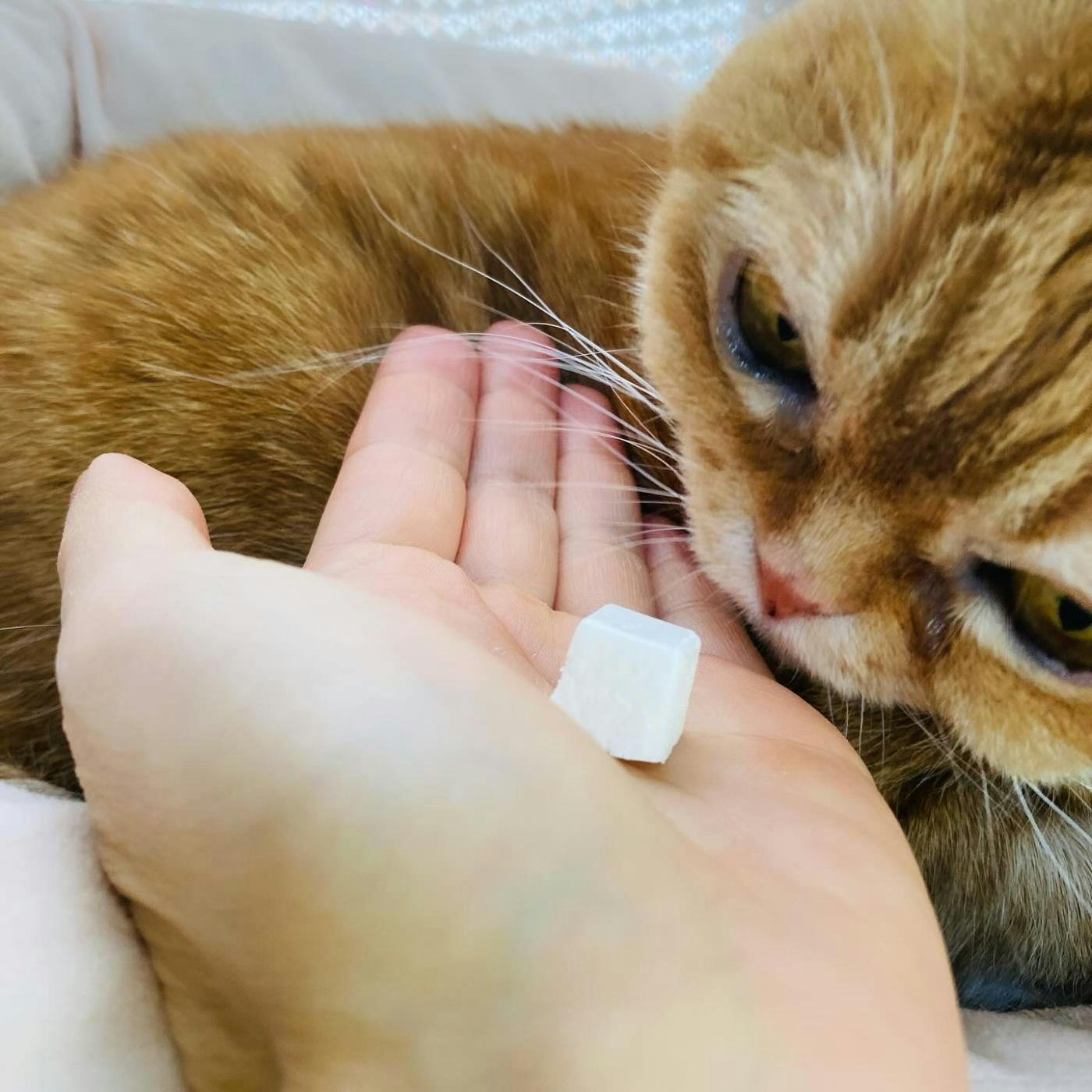 お豆腐みたいなフリーズドライで、さくさく食べてくれました。ちょっとほぐしてあげてもいいですね。特に老化現象でドライフードなんかが喉に詰まりやすくなったお子にもとてもいいと思いますよ。食べやすくなるのでおすすめです。