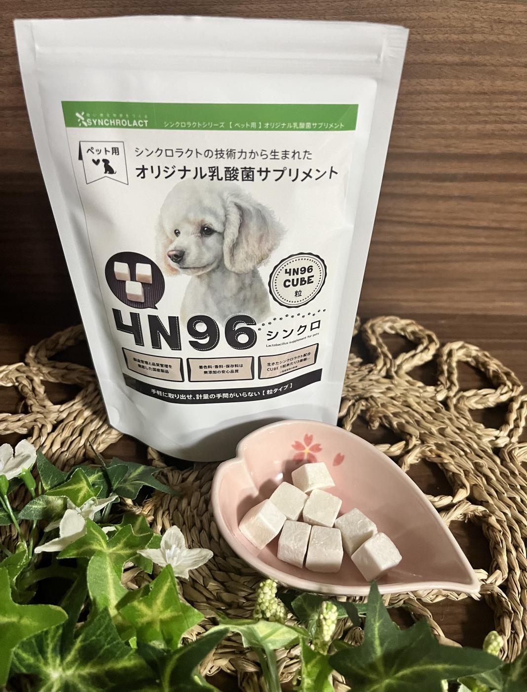キューブ状で与えやすい! (40代 / 女性)「4N96 シンクロ」についてのレビューですこちらはペット用のシンクロライトの技術力から生まれ、腸内環境を改善して健康維持に役立てるオリジナル乳酸菌サプリメントです。4N96→読み方が「シンクロ」です(^^)小さなキューブタイプなので、袋を開けて手で簡単に持て、手が汚れる心配や粉のように散らかる心配がいりません!手軽さや食べやすさを追求して立方体の形状に仕上げられ、なんと1粒で3億個の乳酸菌を与えることができます◎愛犬に早速与えてみました!いつも食べているフードに置くと、まずシンクロから⭐︎シンクロだけ別のところに持って行って大事そうに食べていました(^^)美味しそうでした!愛犬の腸内環境を良いものに保つためにシンクロはとっても必要だと思いました。