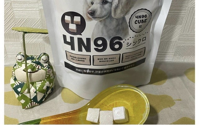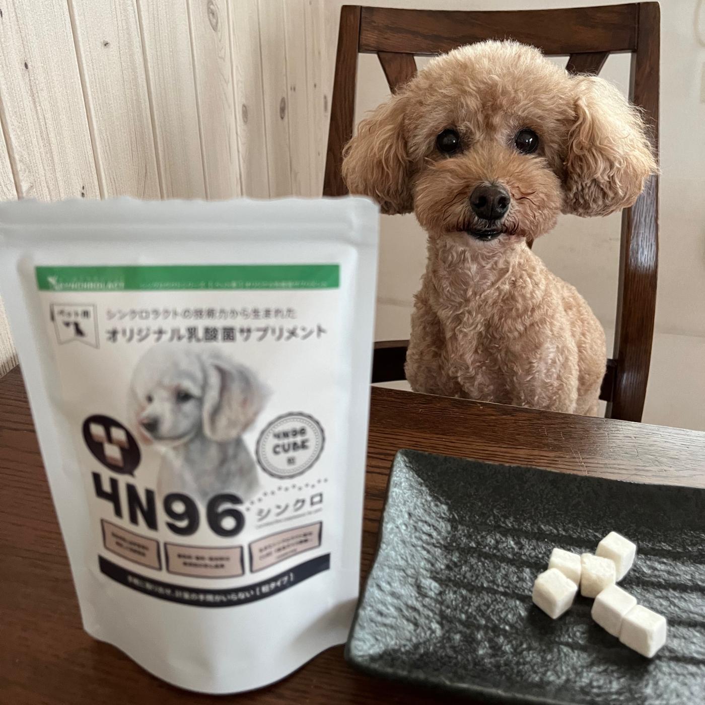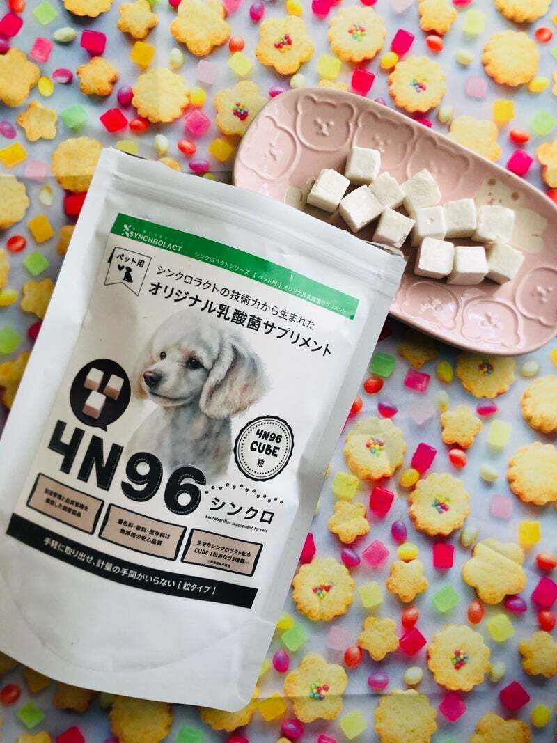 サプリと言うよりおやつ感覚!4N96 CUBE(30代 / 女性)4N96 CUBEについてのレビューです。4N96 CUBE(シンクロキューブ)は、ペット用の乳酸菌サプリメントです。プロバイオティクス乳酸菌が配合されていて、たった1粒で3億個以上の乳酸菌を与えることができるという優れものです。見た目はこのような白いキューブ。めっちゃ軽いです。天文台なんかで売っている宇宙食と同じ軽さ!もっと身近な感じで表現するなら瞬間フリーズドライされた豆腐ってこんな感じだろうなあって思います。とにかくサクサクっと軽い感じです。ペット用のサプリメントって人間用もそうですが、飲みやすさ食べやすさはそこまで重視されていないものが多くって、愛犬も食べなかったり、与える側が分量計算するの面倒になってしまったりというものがある中で、これはおやつ感覚で与えることができるのがいい感じです。我が家の愛犬はとっても気に入ったようで、袋を見て舌なめずりをして待機中。いつもそのままあげちゃうのですが、【待て】をされて、視線をそらしてじっと我慢(笑)【良し】で急いで食べに来てくれます。サプリメントではなく、もはやおやつ感覚で食べてくれるので嬉しいかぎりです。サクサク軽い食感なので、その食感も良いのかシャリシャリと良く噛んで食べてくれます。人間の指でも力入れたら粉々に出来そうなサクサクなので、歯が弱い子でも食べやすいと思います!その点もいいなーと思いました!犬は私の数倍以上のはやさで時間が進んで行くので、積極的に健康管理してあげたいなと思っています。