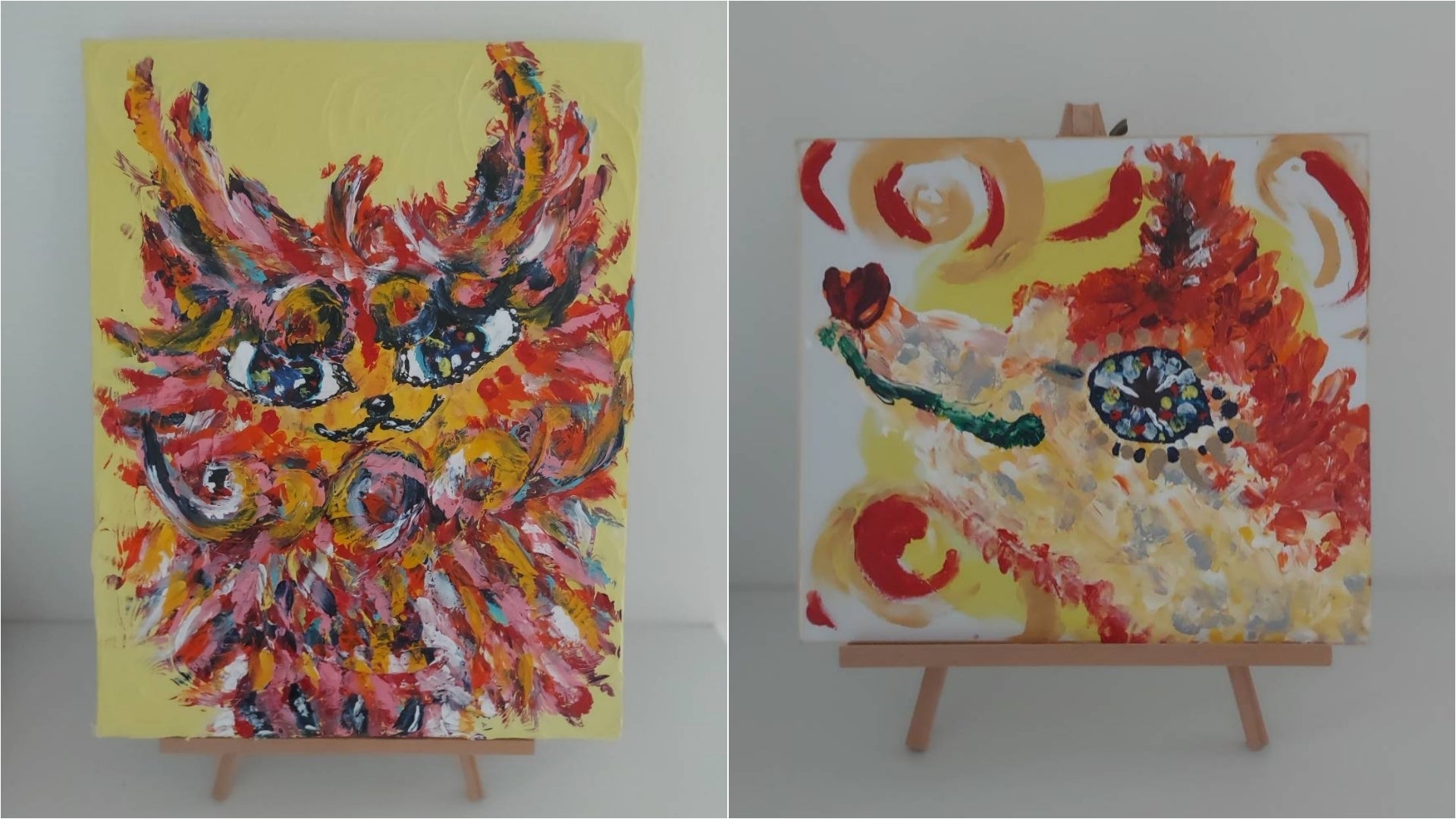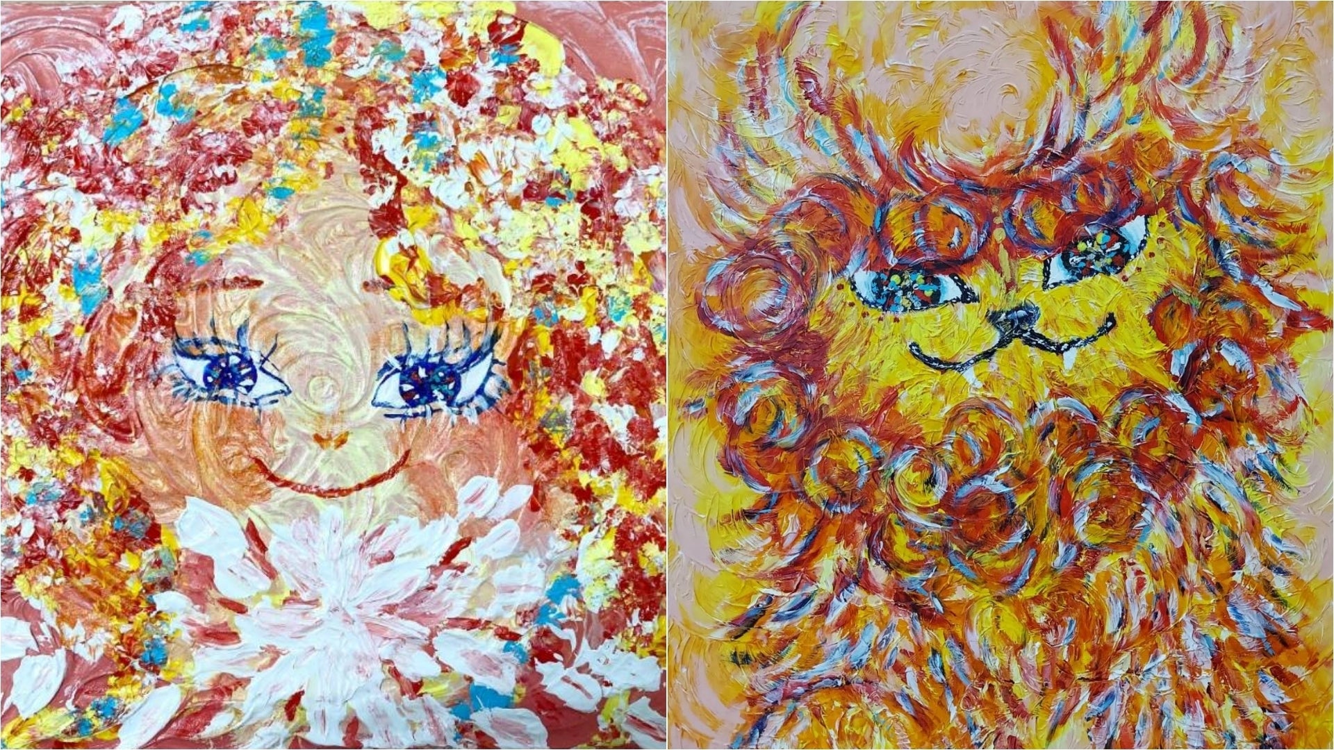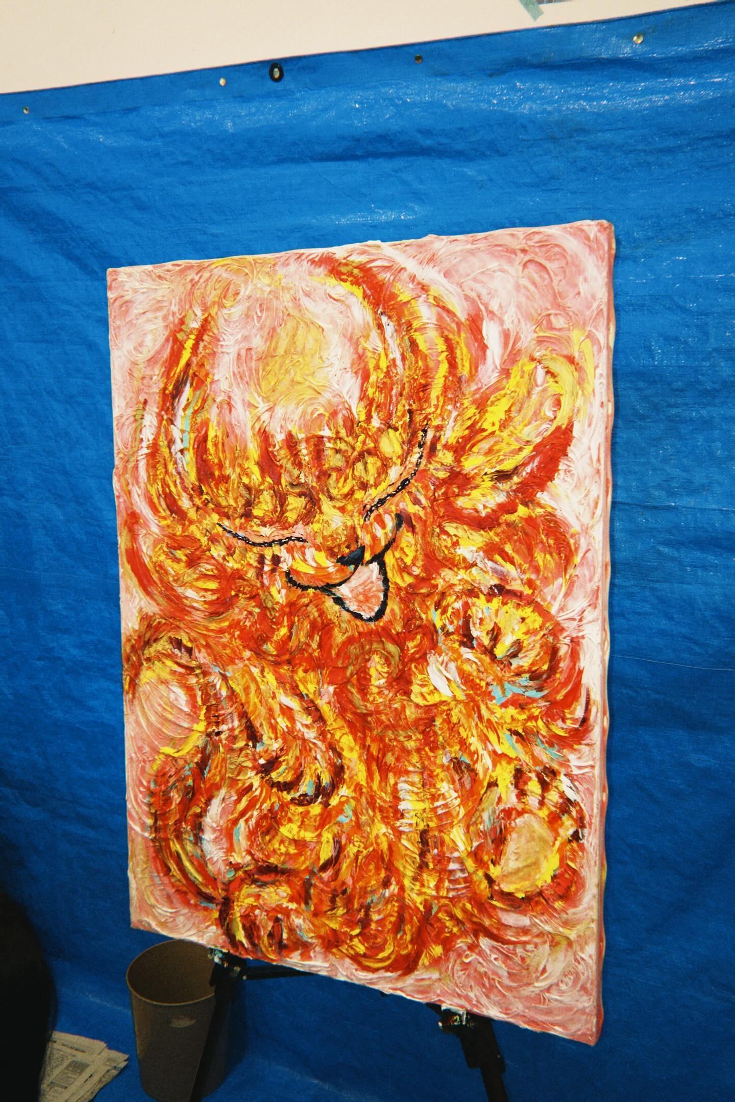 私はキャンバスにモデリングペーストでデコボコ渦巻きを作り、その上からアクリル絵の具で指描きアートを描いています。