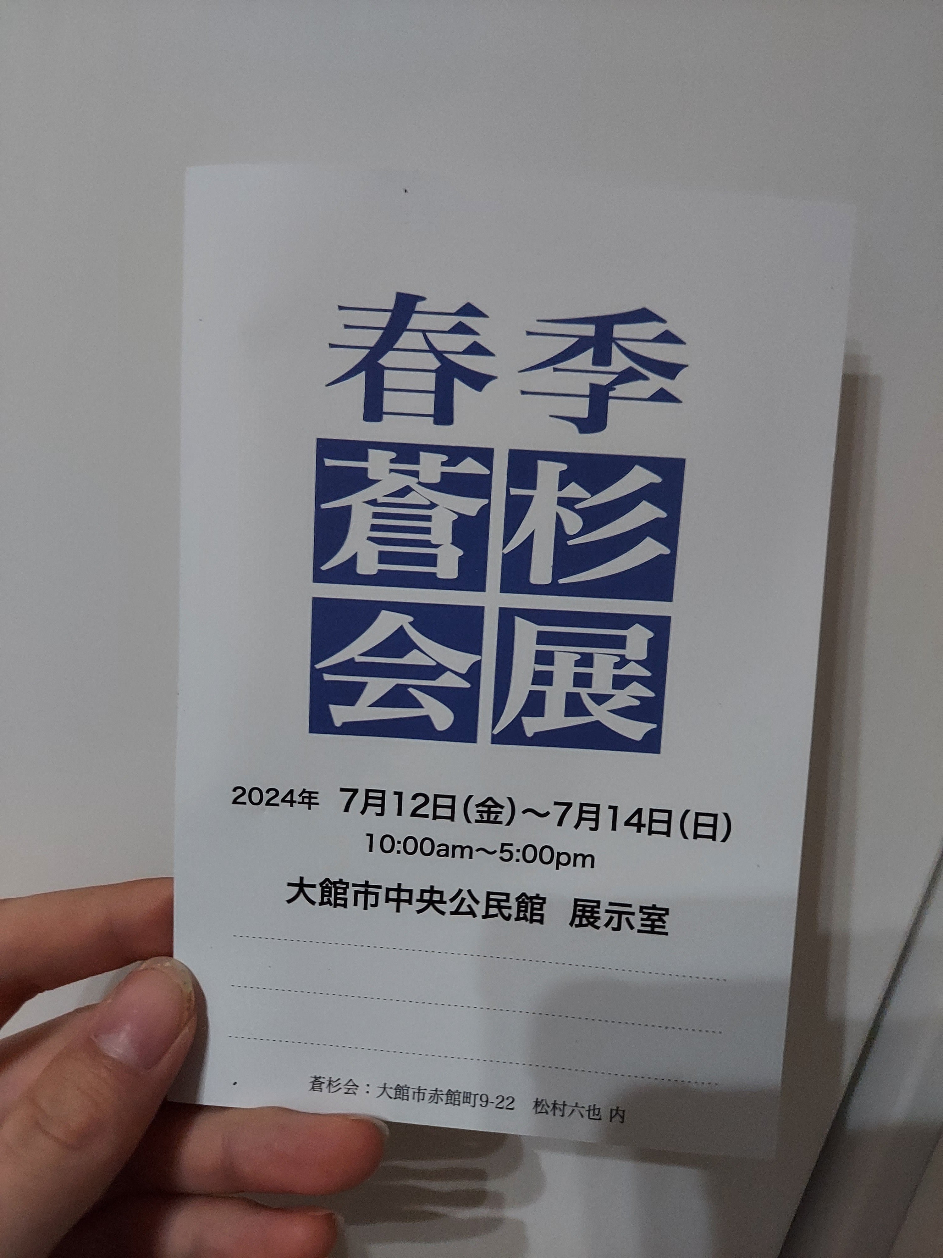 今日は明日に開かれる地元大館の展示会の作品を搬入してきました。全部で6点無事運び終えることが出来ました。最後まで時間のかかっていた作品もギリギリ完成し搬入できて安心です。明日はどんなお客様が見に来てくださるかわくわくです。 私の他に50点ほど他の会員の方々の作品が展示されますので見応えありそうです。他の会員の方々はベテランなので美しい作品ばかりで、そんな中での展示は緊張しますがまずは楽しみたいと思います。