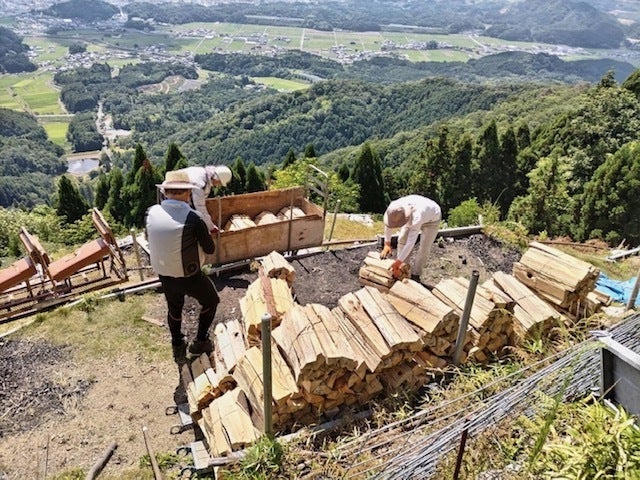 送り火当日までもう少し!8月2日、薪上げをしました。薪上げは沢山の準備の中でも、特に特別な気持ちで臨んでいます。どうかモノレールが順調に動きますように・・。モノレールの老朽化によって、重い薪を運搬途中でエンジンが停止したり脱線したりと予想外のハプニングの連続・・。作業終了予定時間を大幅に超えることも度々あり、猛暑の中これはもう大変な作業でした。それが・・・今年はというと!昨年皆様からご支援いただいたお陰で、薪上げまでにモノレールのローラー部分を修理することが出来ました!!そのお陰で、カーブを曲がる際の大きな傾きや、急こう配もなんのその。スイスイと登る姿は頼もしく、若返ったようです。皆様のお陰です。ご支援くださった皆様には、心から感謝を申し上げます。ありがとうございました。