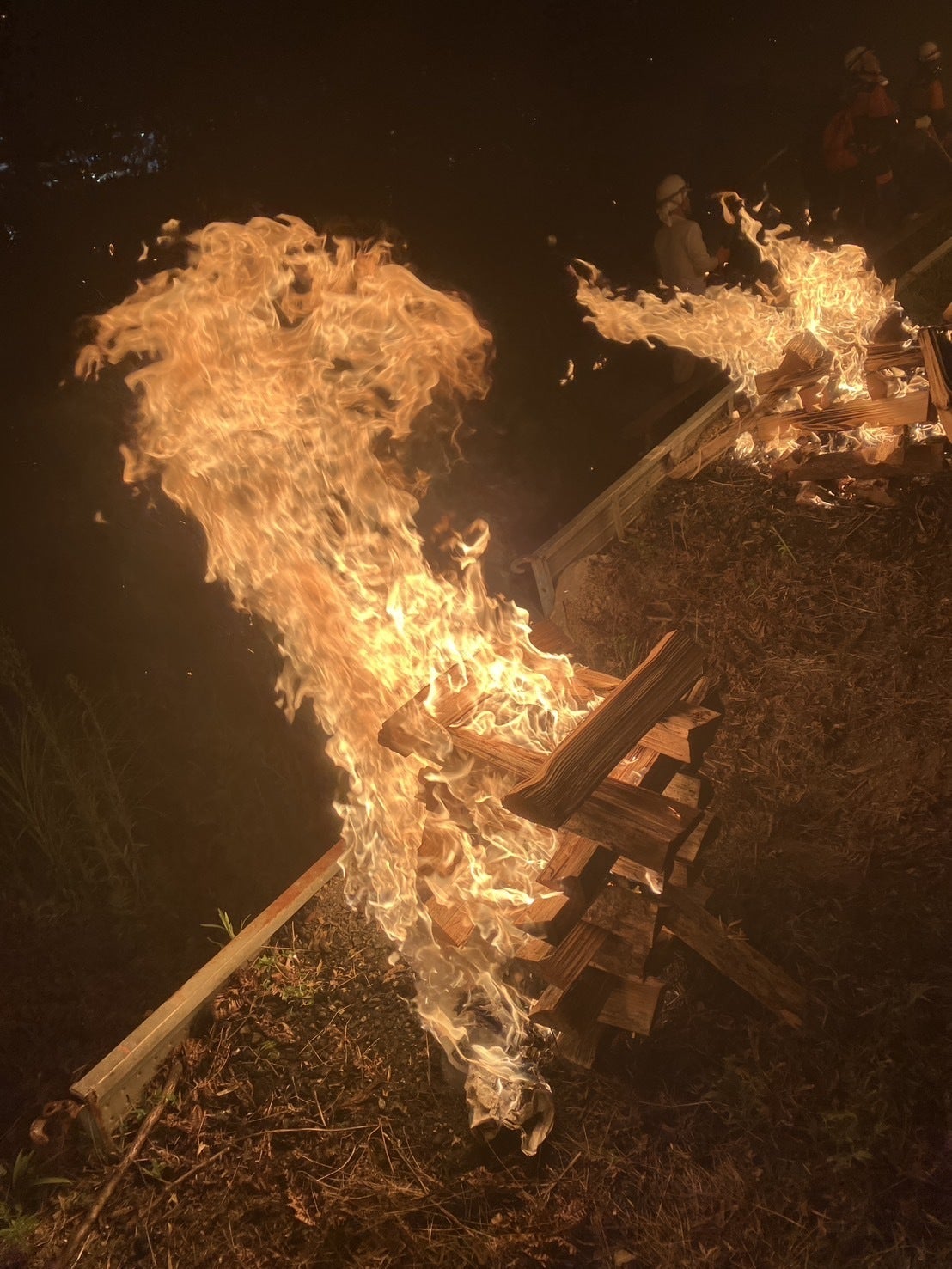 丹波大文字 送り火当日の状況です。ここまでいろいろありましたがみなさまのおかげで無事に終える事ができ、丹波大文字保存会一同、感謝しかありません。高齢化、獣害被害、モノレール老朽化とクリアしないといけない課題は山積みですがこの伝統の「灯」を絶やさぬよう少しづつでも前へ進めて参りたいと思います。みなさまのご支援ご協力をよろしくお願いいたします。