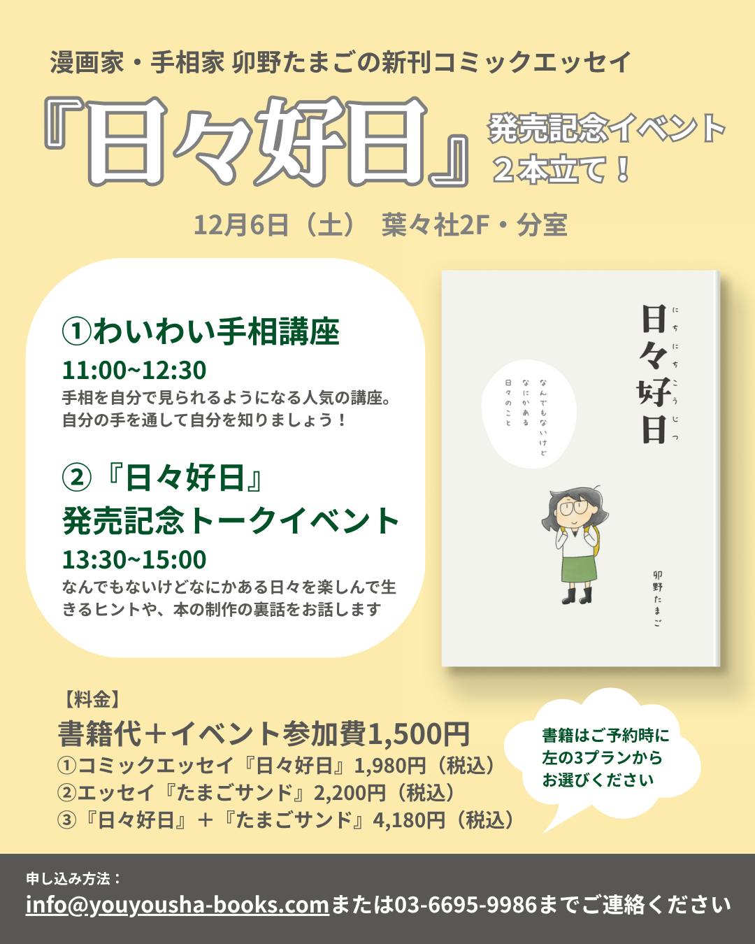 こちらのイベントでは、今回の新刊制作の裏側についても触れつつ、『日々好日』全体のテーマでもある「なんでもないけどなにかある日々」を楽しむ思考・目線などについてお話をしたいと思います。こちらも質問コーナーも設けつつ、双方向でいろんなお話しができればと思っていますので、卯野さんの考え方を知りたい、自分の気づきをシェアしたいという方はぜひご参加いただけたらうれしいです!