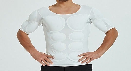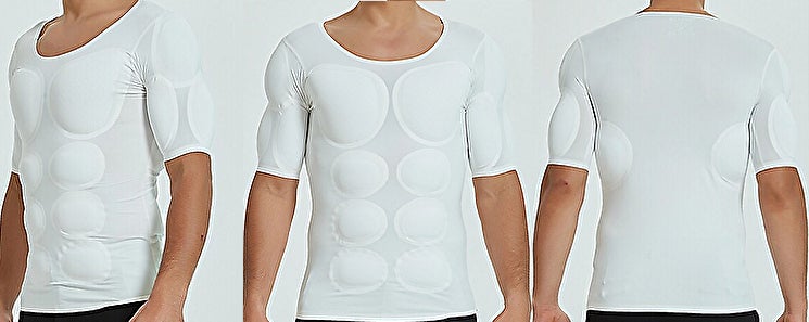 この課題解決についてご提案するのは、肩・腕・胸・腹にパッドを入れることで、鍛えられていない体でもマッスルな体に見せることができる、新発想の「マッスルTシャツ」です。