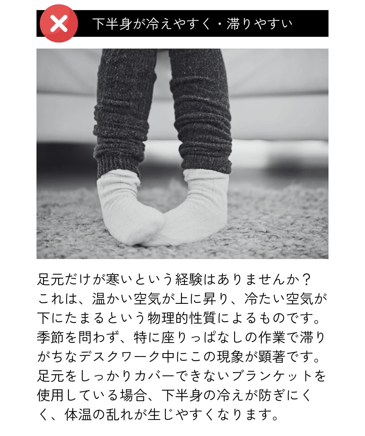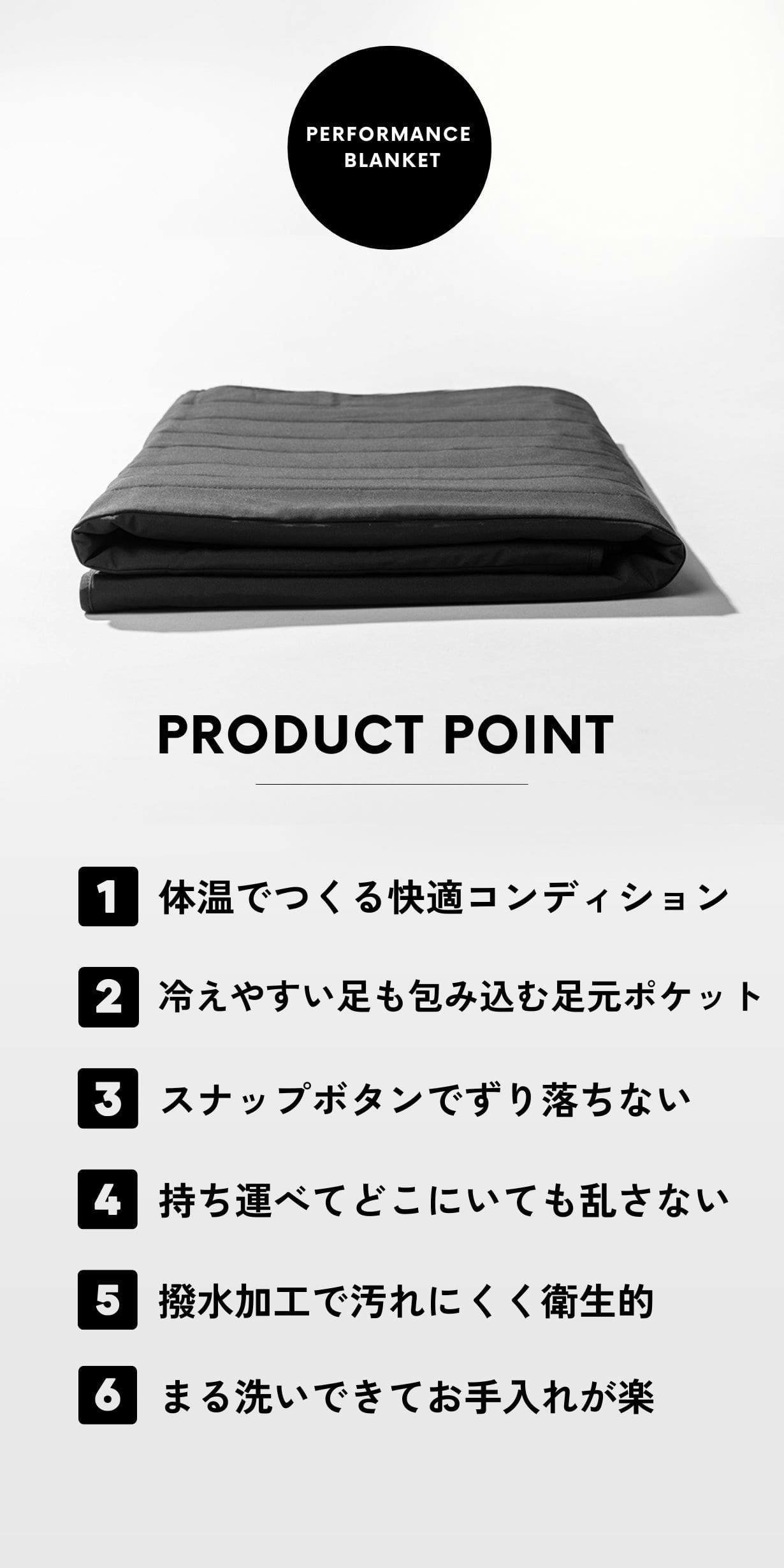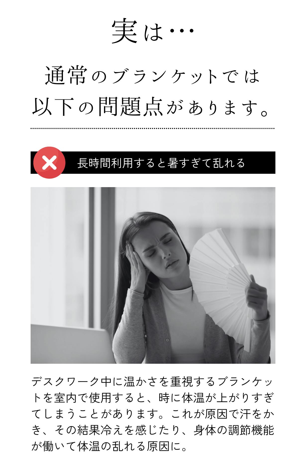 パフォーマンスブランケットは、座っている間に感じる冷えや室内の寒暖差がもたらす不快感や集中しづらさを軽減するために開発されました。体温の乱れが原因で生じる作業効率の低下や快適さの損失をサポートします。