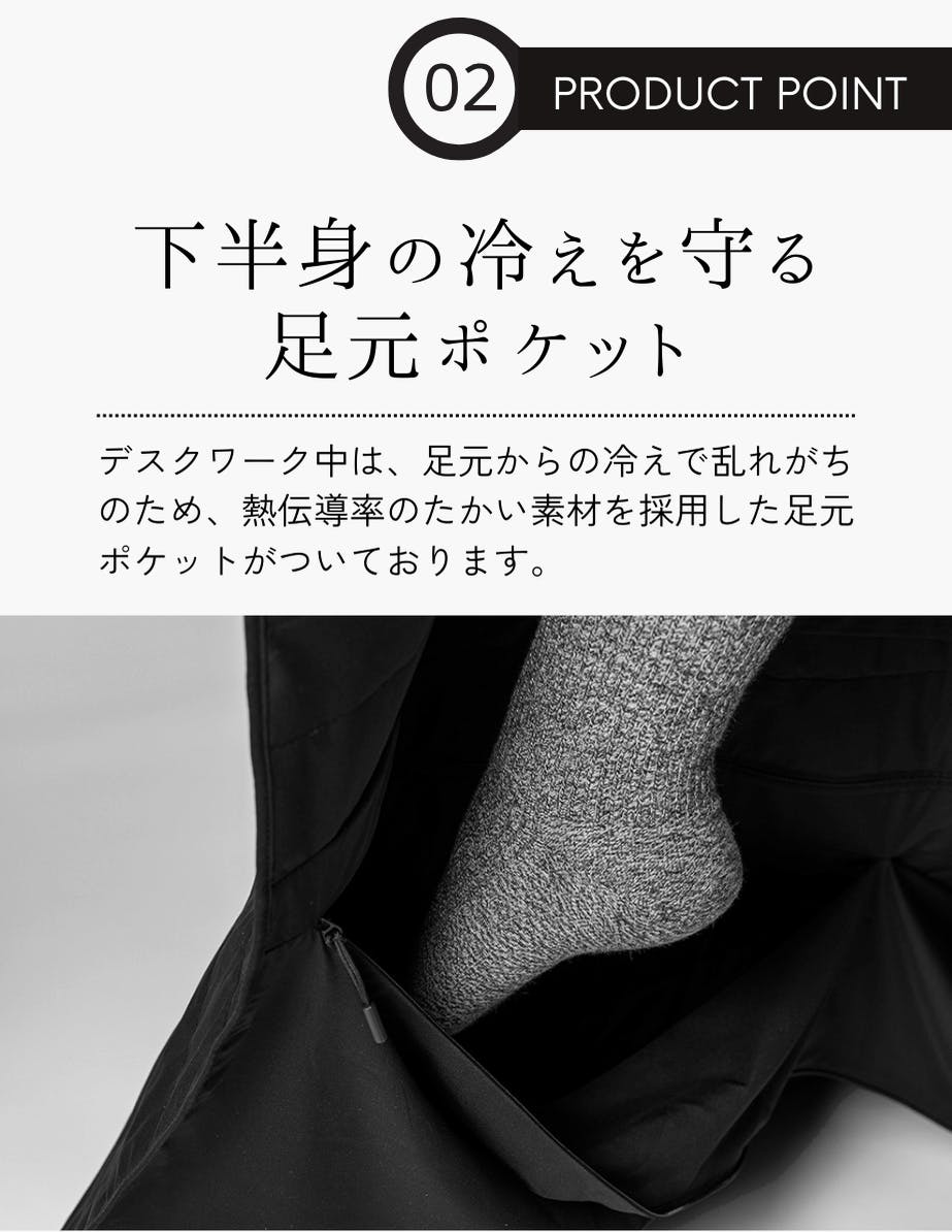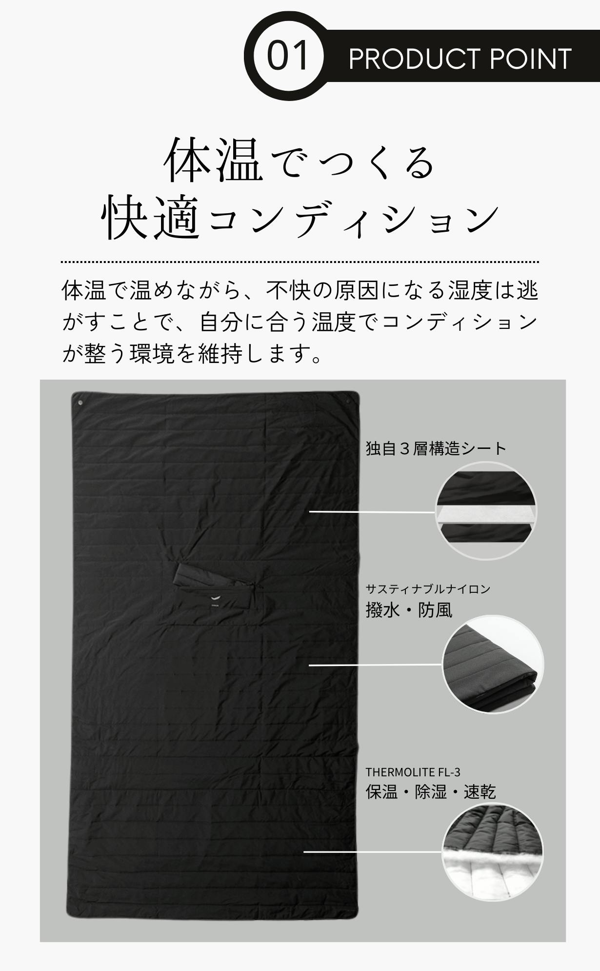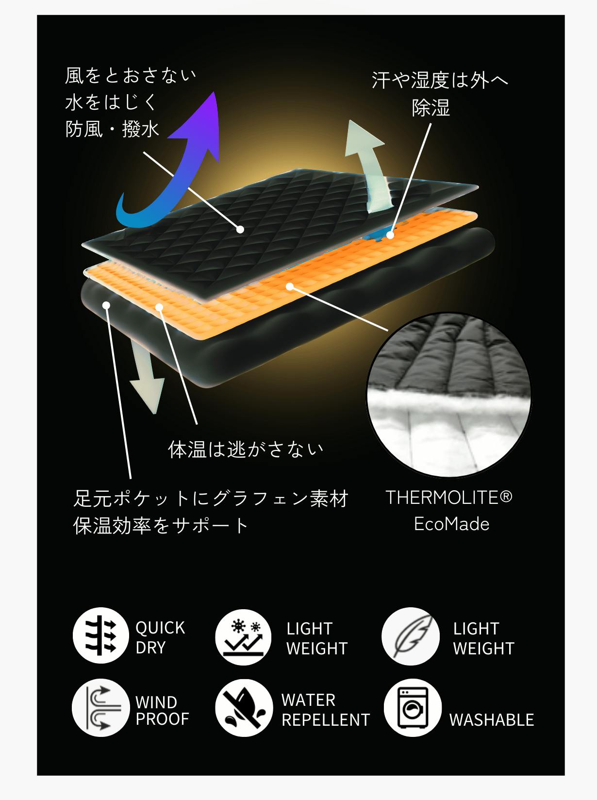 座り時間の仕事や休息、持ち運びの邪魔にならないように、軽さとゴワつかない柔らかさ、快適な温かさを独自の3層構造で実現。外気をシャットアウトして、体温を逃がさす、湿度は外へ排出して快適な環境を維持します。