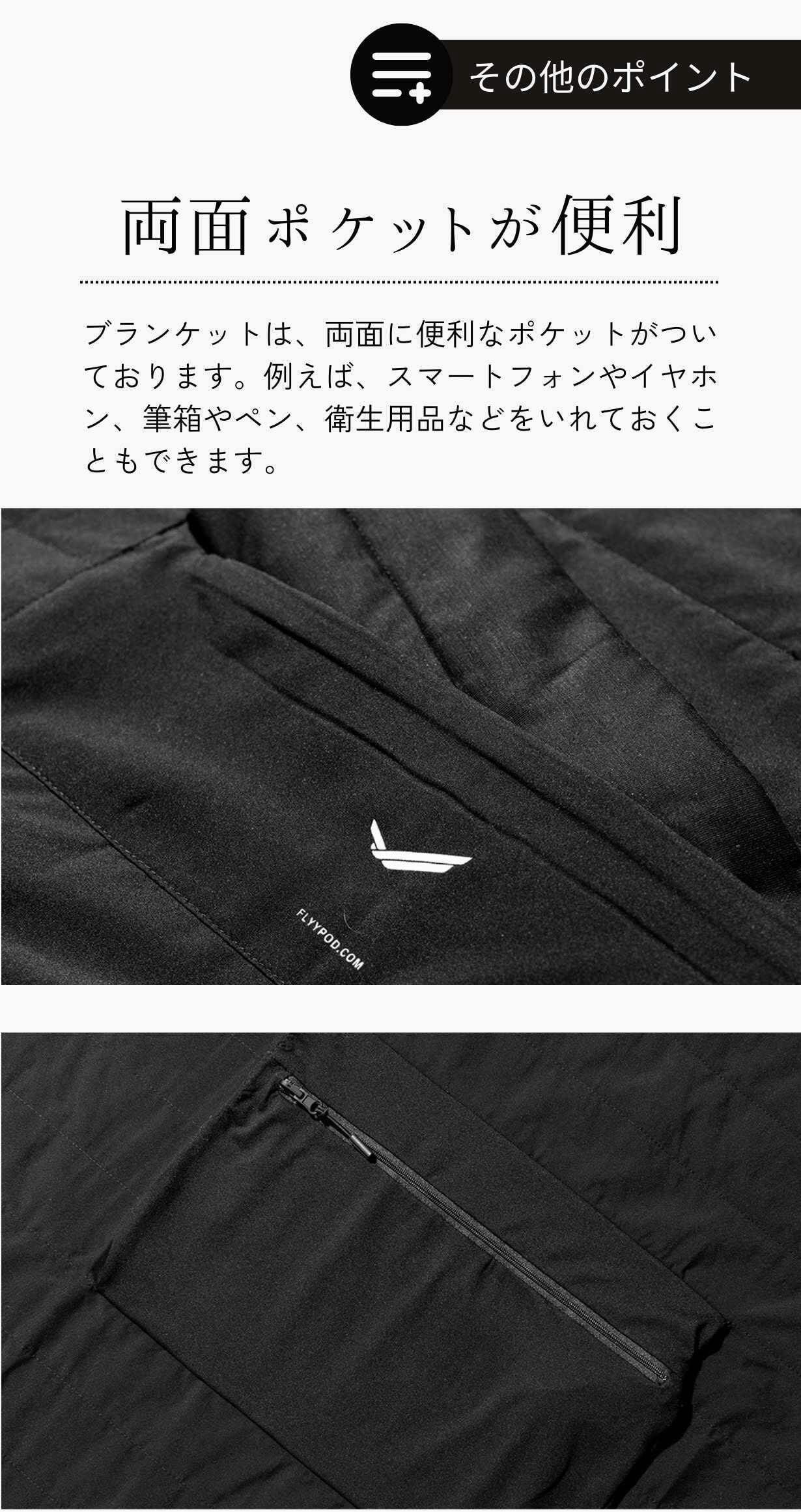 メーカーのロゴが入ったスナップボタンは、「バチッ」としっかり留まり、使いやすさを追求したデザインです。上半身に羽織りたいときや、下半身だけを暖めたいときに便利で、ブランケットがズレ落ちる心配を防ぎます。その結果、集中や休息を乱すことなく快適にお過ごしいただけます。