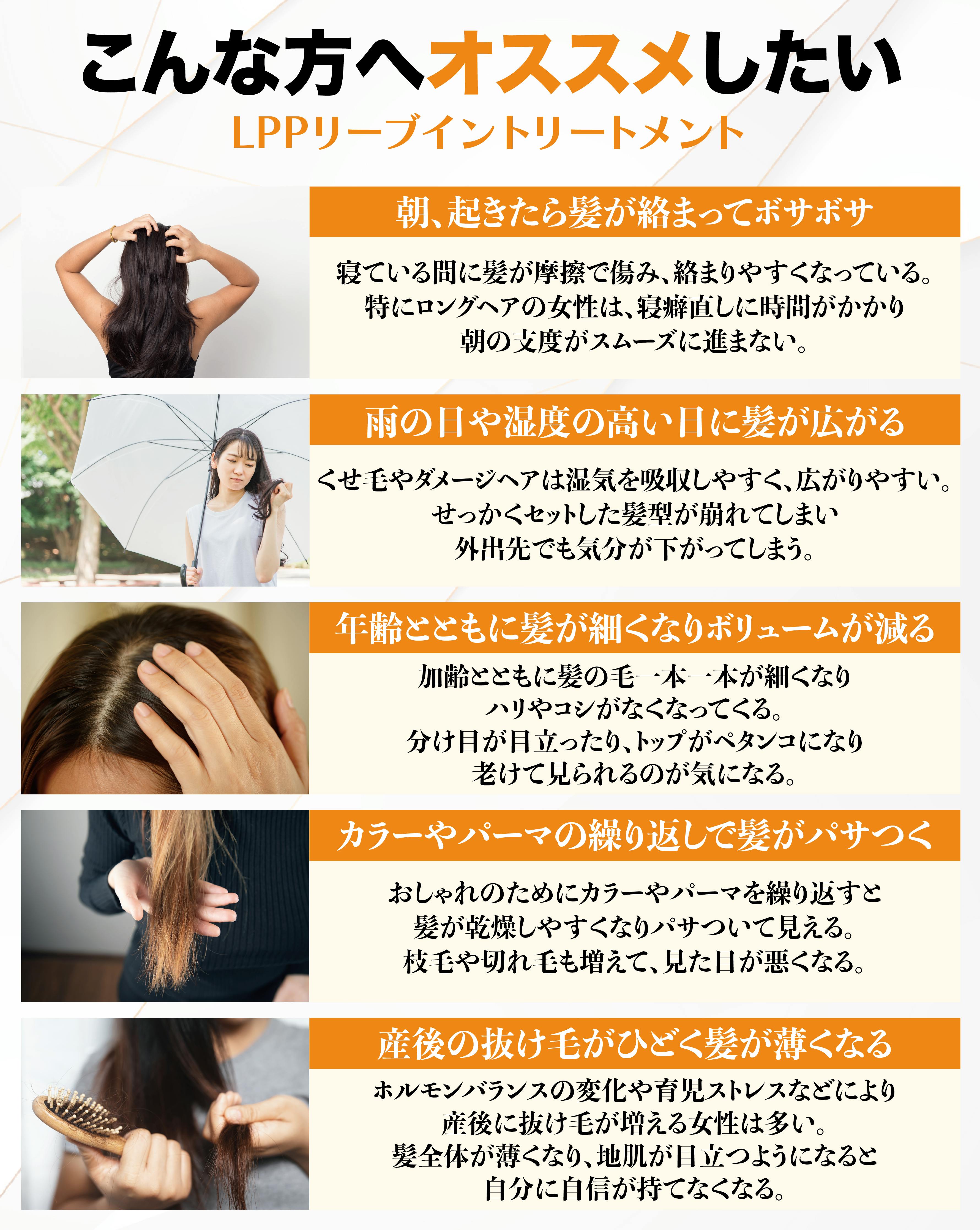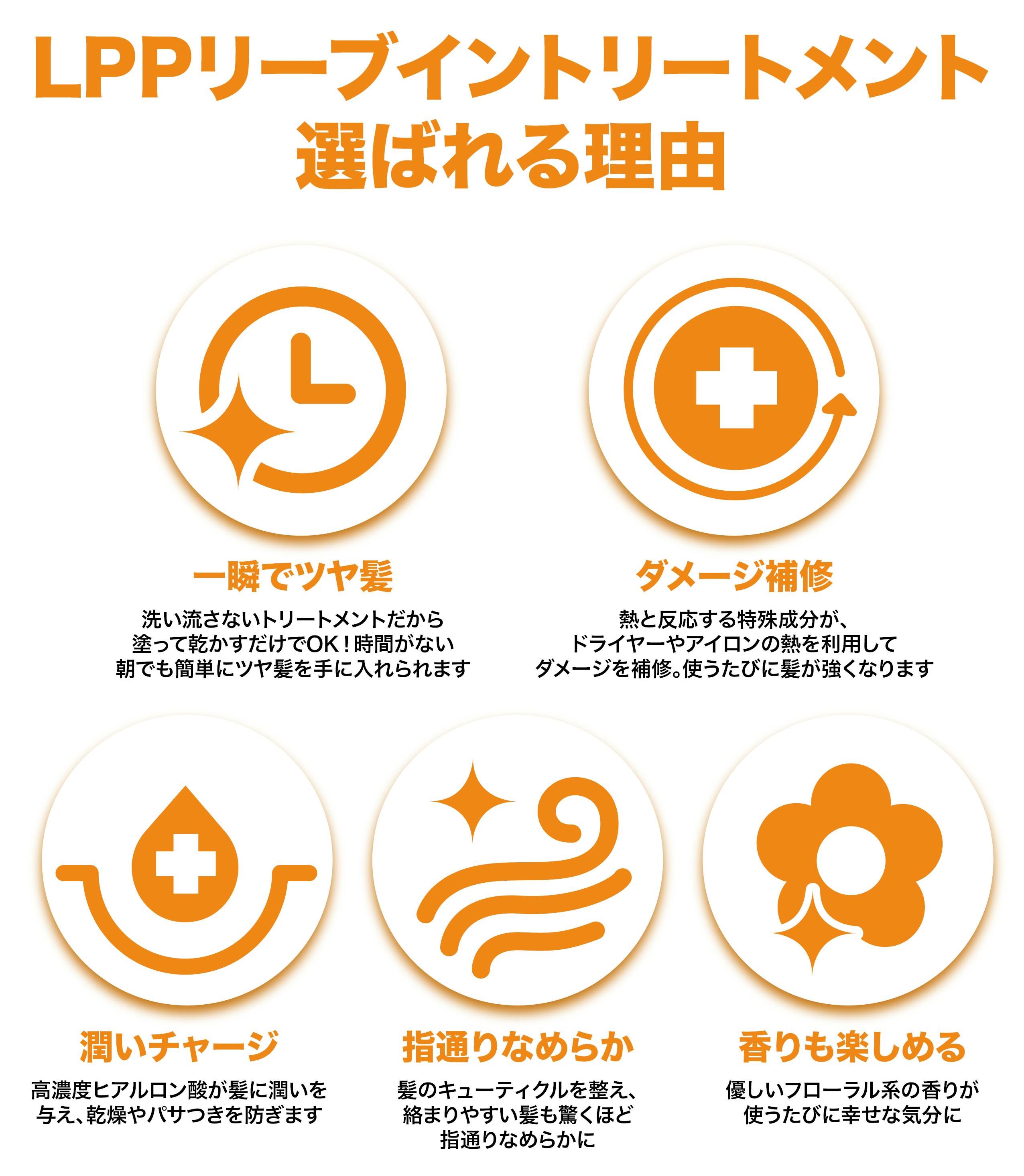 私たちは、忙しい毎日を送る日本の女性に、手軽に美髪を手に入れてほしいと願っています。LPPリーブイントリートメントは、そんな願いを叶えるための、まさに魔法のようなトリートメントです。あなたの髪も、LPPリーブイントリートメントで、生まれ変わったように美しく輝きます。