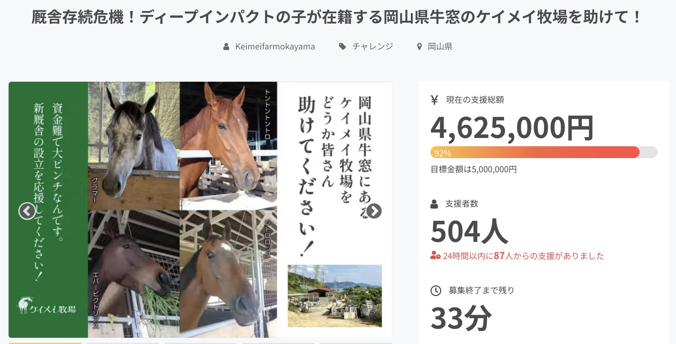 2024/08/01 00:20お世話になっております。ケイメイ牧場の野崎です!いや〜ラスト3分、、、痺れました。475万円から、一気に達成の大型支援。なんとか最終日3分前に達成できました。本当に本当に本当に、ありがとうございます!今日は朝から鳥肌が止まりません。2025年の7月31日も今日の感動を思い出すと思います。思い起こせば5月22日のダービー(東京優駿)ウィークにクラウドファンディングに挑戦することを決めました。ケイメイ牧場には、ダービーを勝った、伝説的な名馬ディープインパクトの子孫がいます。今日改めて思ったこと。ディープがどこかで力を貸してくれたんだなと。あなたの名前があったから、テレビ局の取材が来て、youtubeに取材が出た時に3日で2万再生を超えて、多数の方にプロジェクトを知ってもらえて。なんとかラスト3分で奇跡の達成!ハナ差です!『世界のホースマンよ見てくれ。 これがケイメイ牧場のクラウドファンディングだ!』この名実況を最後に、この夏の最大のチャレンジ、ケイメイ牧場のクラウドファンディングを締めくくらせてもらいます。最後までお付き合い頂いた、全ての皆様へ。心からの感謝を込めて!PS、R様、お会いできるのを心から楽しみにしております。最後3分の直線の鞭、本当にありがとう御座いました。 もっと見る