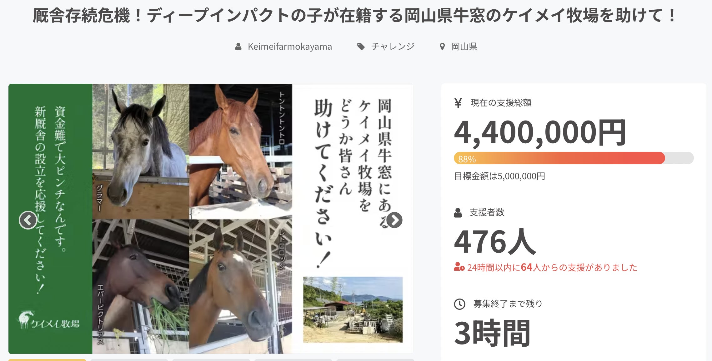 お世話になっております。ケイメイ牧場の野崎です!いや〜ラスト3分、、、痺れました。475万円から、一気に達成の大型支援。なんとか最終日3分前に達成できました。本当に本当に本当に、ありがとうございます!今日は朝から鳥肌が止まりません。2025年の7月31日も今日の感動を思い出すと思います。思い起こせば5月22日のダービー(東京優駿)ウィークにクラウドファンディングに挑戦することを決めました。ケイメイ牧場には、ダービーを勝った、伝説的な名馬ディープインパクトの子孫がいます。今日改めて思ったこと。ディープがどこかで力を貸してくれたんだなと。あなたの名前があったから、テレビ局の取材が来て、youtubeに取材が出た時に3日で2万再生を超えて、多数の方にプロジェクトを知ってもらえて。なんとかラスト3分で奇跡の達成!ハナ差です!『世界のホースマンよ見てくれ。 これがケイメイ牧場のクラウドファンディングだ!』この名実況を最後に、この夏の最大のチャレンジ、ケイメイ牧場のクラウドファンディングを締めくくらせてもらいます。最後までお付き合い頂いた、全ての皆様へ。心からの感謝を込めて!PS、R様、お会いできるのを心から楽しみにしております。最後3分の直線の鞭、本当にありがとう御座いました。