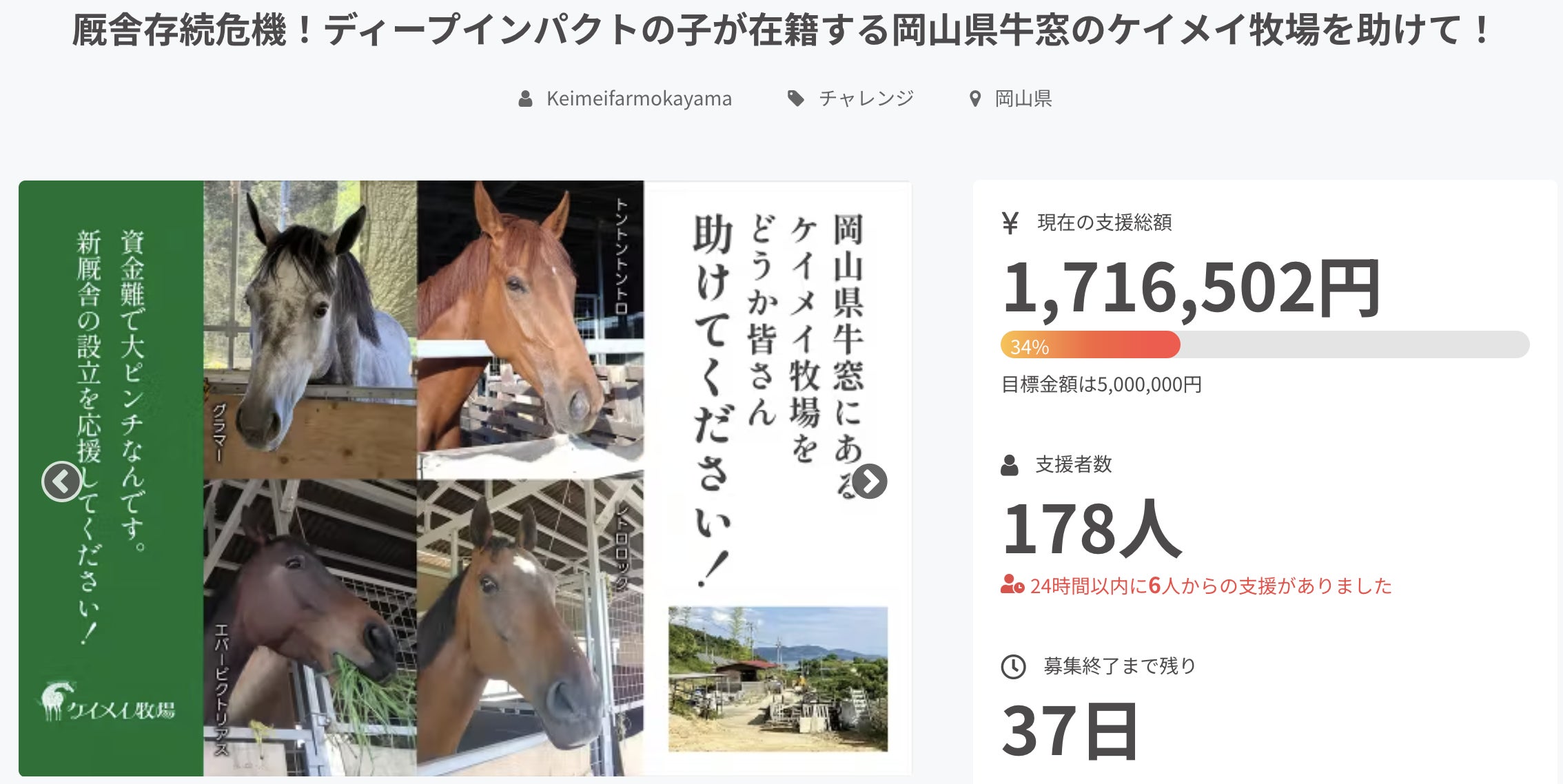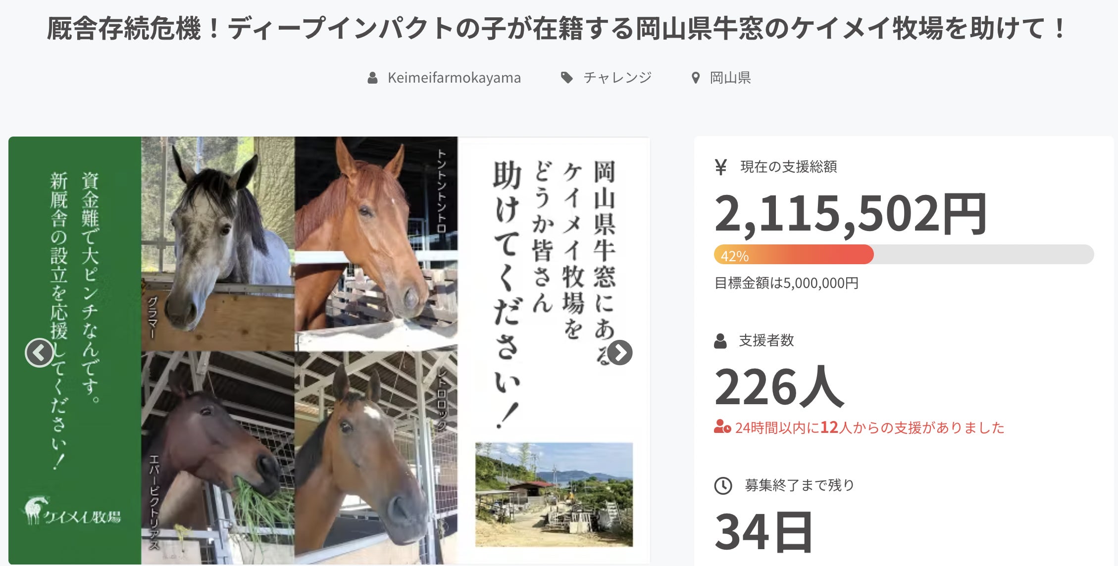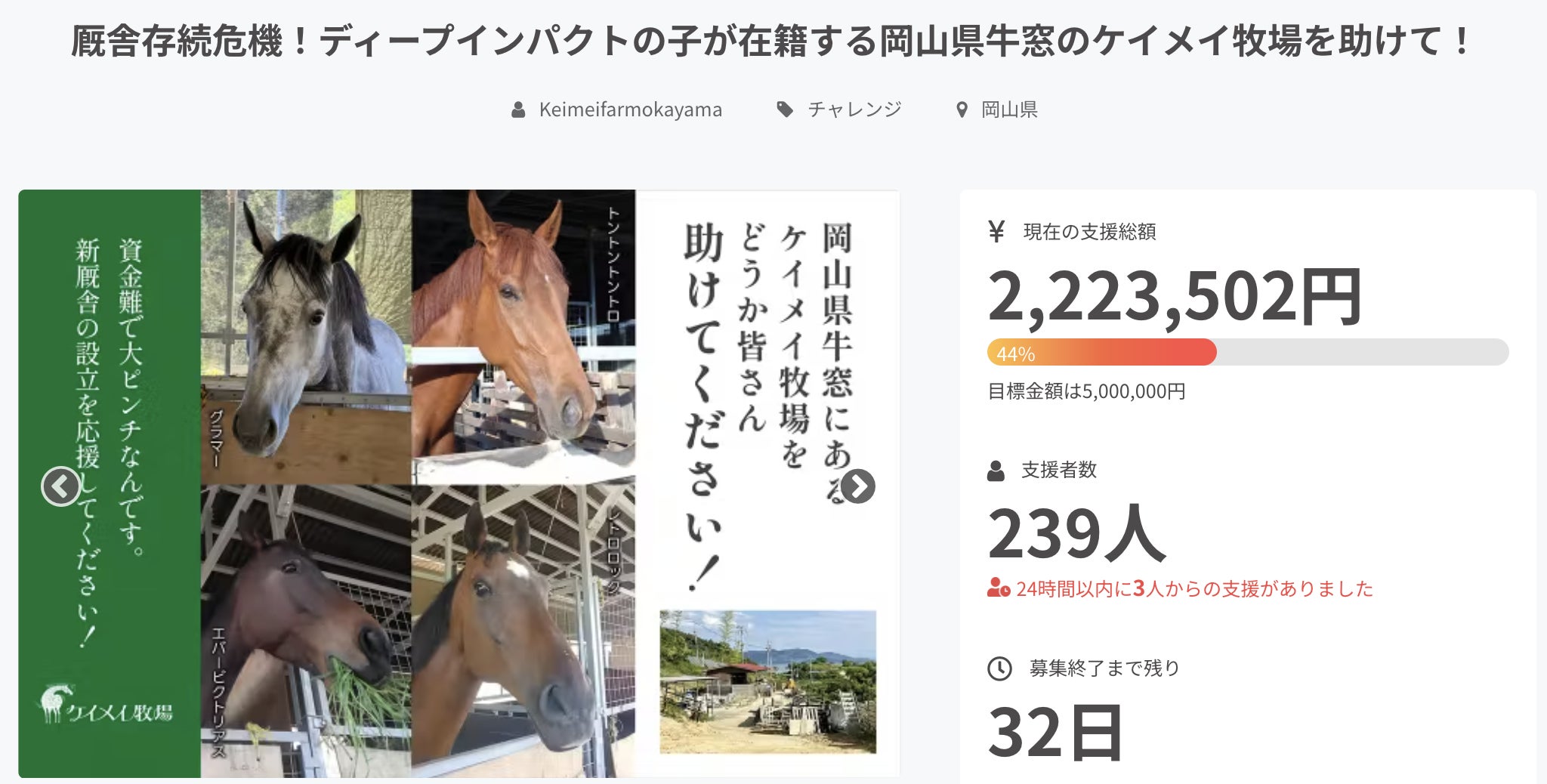 お世話になっております。ケイメイ牧場の野崎です!RSKさんの取材、なんとyoutubeにも転載してもらっています!https://www.youtube.com/watch?v=CxwYx4u3Jwsこの動画がすごい、、、公開4日で2万再生、、、ありがたい限りです!色々驚きながらも本日の進捗報告を!6月29日 21:40現在残り32日支援人数 239名※昨日の活動報告から16名の方にご支援を頂きました!本当にありがとうございます!目標 5,000,000円現状 2,223,502円目標達成まで2,776,498円!こんなことになるなんて、、、というレベルまで反響がすごいです!youtubeは見るものだったのが、、、、出るものになるなんて、、、やりがいをすごく感じます!PS,可能であれば、X等、SNSでの拡散協力を何卒よろしくお願いいたします。【拡散用クラウドファンディングURL】https://camp-fire.jp/projects/view/769842