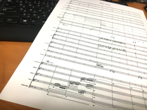 お待たせしました。オリジナルテーマ曲、まもなく誕生! ここに来てようやく、ようやく、このオーケストラの顔?名刺?代表曲となるテーマ曲の概要が見えてきました。写真は先程、上がってきたばかりの譜面の1ページ目。テーマへの導入部分です(見えるかな?)この部分だけで、なかなかゴージャスなサウンドの予感がしてきます。 まもなくここで(メインページでも)デモ音源の一部を(打ち込みになりますが…)お聴かせ出来ると思います。なにはともあれこの場で真っ先に公開いたしますので、今しばらくお待ち下さい。 乞うご期待! まもなく誕生です!