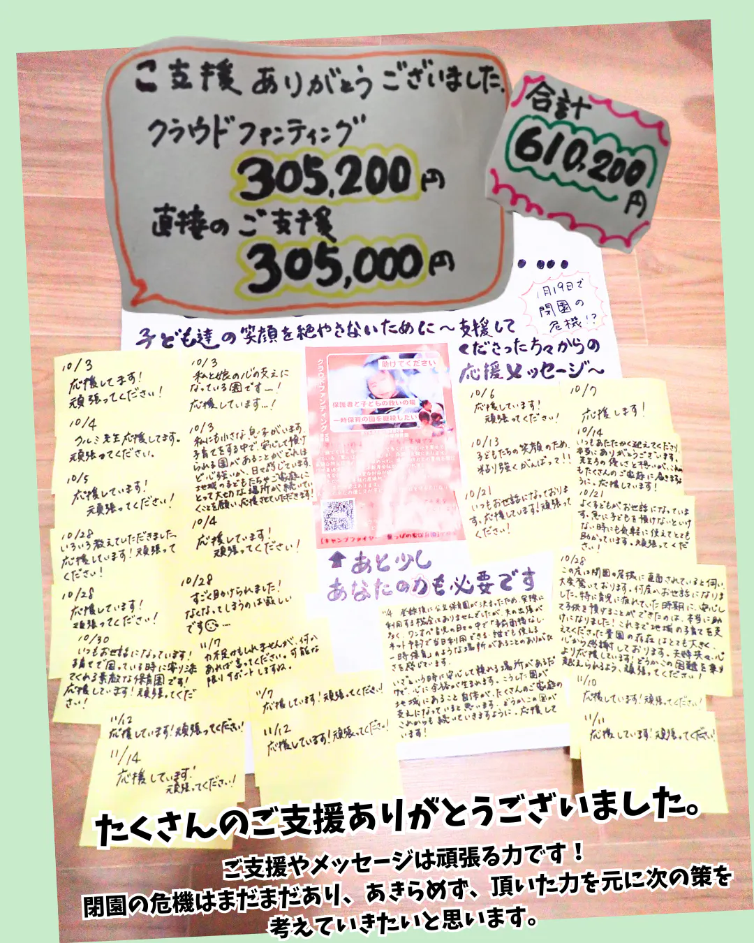 2025/12/03 13:54たくさんのご支援ありがとうござます。返礼品で保育券を選ばれた方、ぜひご利用お待ちしています。差額を当日お支払い頂きましたら、休日保育での利用も可能です。12月7日(日)に休日保育があります。休日保育ご予約大家の不動産屋からは連絡がなく、12月12日に消防署からお呼び出しがありお話を聞きに行ってきます。まだ明るい話をすることが出来ず申し訳ないばかりです。継続支援をと、ありがたいお言葉も頂きました。まだまだあきらめずにいきたいと思います。継続支援の場所を開設いたしました。会員登録なしで、匿名で500円からご支援いただけるようになっています。よろしくお願いします。寄付先 もっと見る