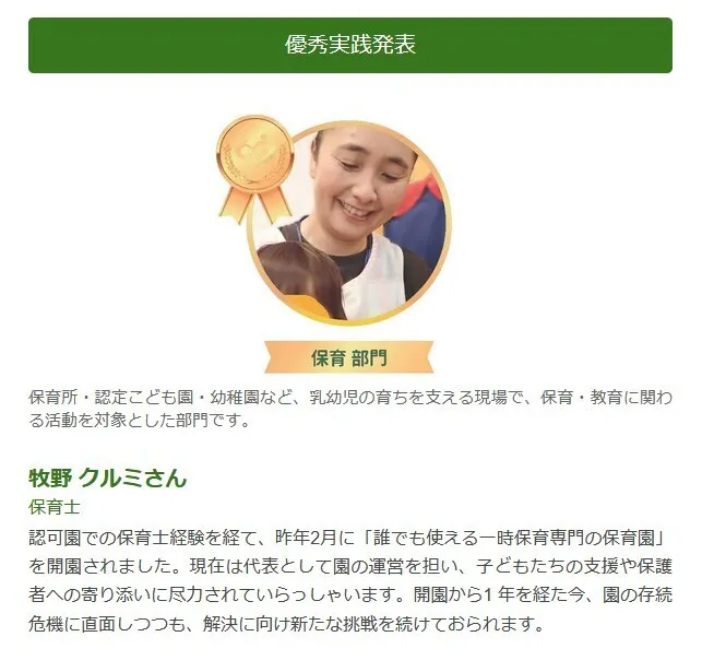 その資格を生かして保育実践しているということで【優秀実践者】に選出していただきました。