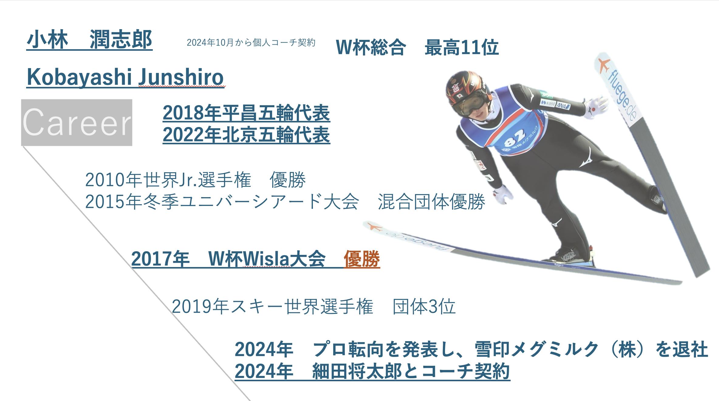 2024年4月からプロとして活動を始めた小林潤志郎選手(W杯優勝経験、オリンピック代表)と10月より個人コーチ契約を結び、彼が世界の舞台でより活躍できるようにサポートしていく予定です。