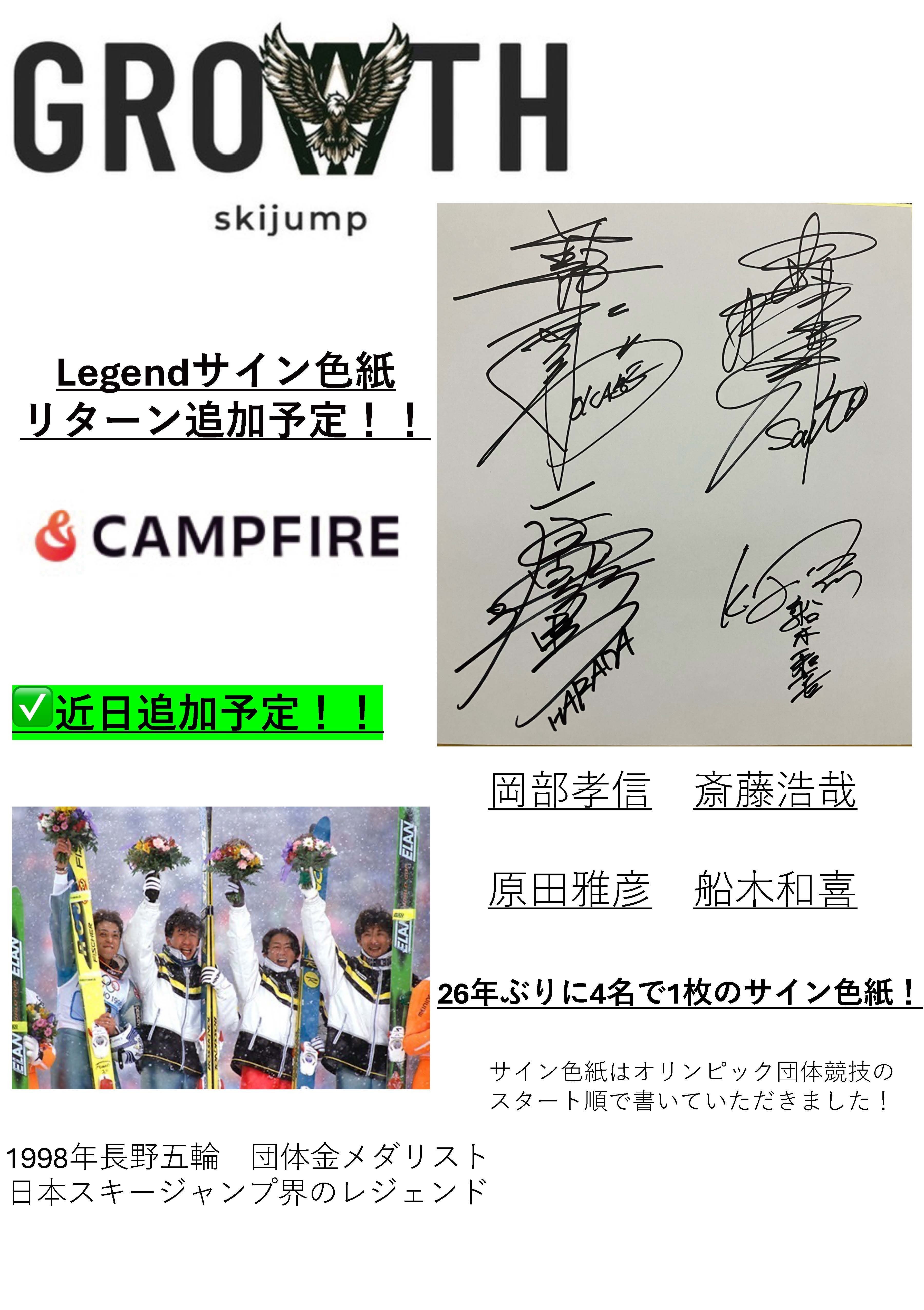 あと残り1週間となりました。多くの皆様のご協力に感謝しております。最後のリターン品追加に1998年長野オリンピック団体金メダリストメンバー4名のサイン色紙が並びます!日本スキージャンプ界の偉大な方々からご賛同・協力をいただきました!4名が1つの色紙にサインを書くことがオリンピックの年以来かもしれない・・・?とのことです!近日リターン追加になります!!