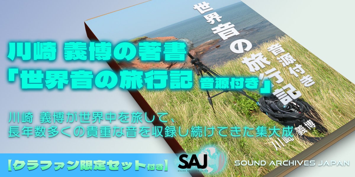 また、川崎 義博が世界中を旅して、長年数多くの貴重な音を収録し続けてきた集大成ともいうべき著書「世界音の旅行記 音源付き」を出版に先駆けてご用意することになりました。この著書には、世界中の音源が数多く収録されている特別なものです。(出版に先立ちご提供)