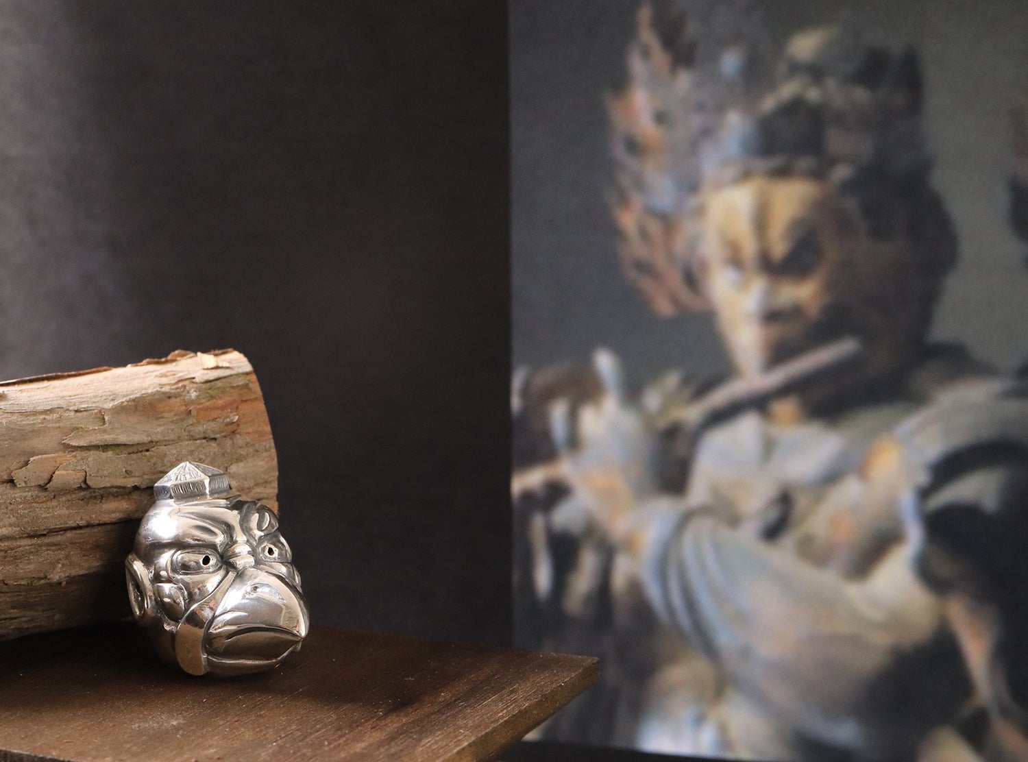 鋭い目には金環が嵌入(かんにゅう)され、カッと大きく開かれた口には上下一対の牙がのぞいています。