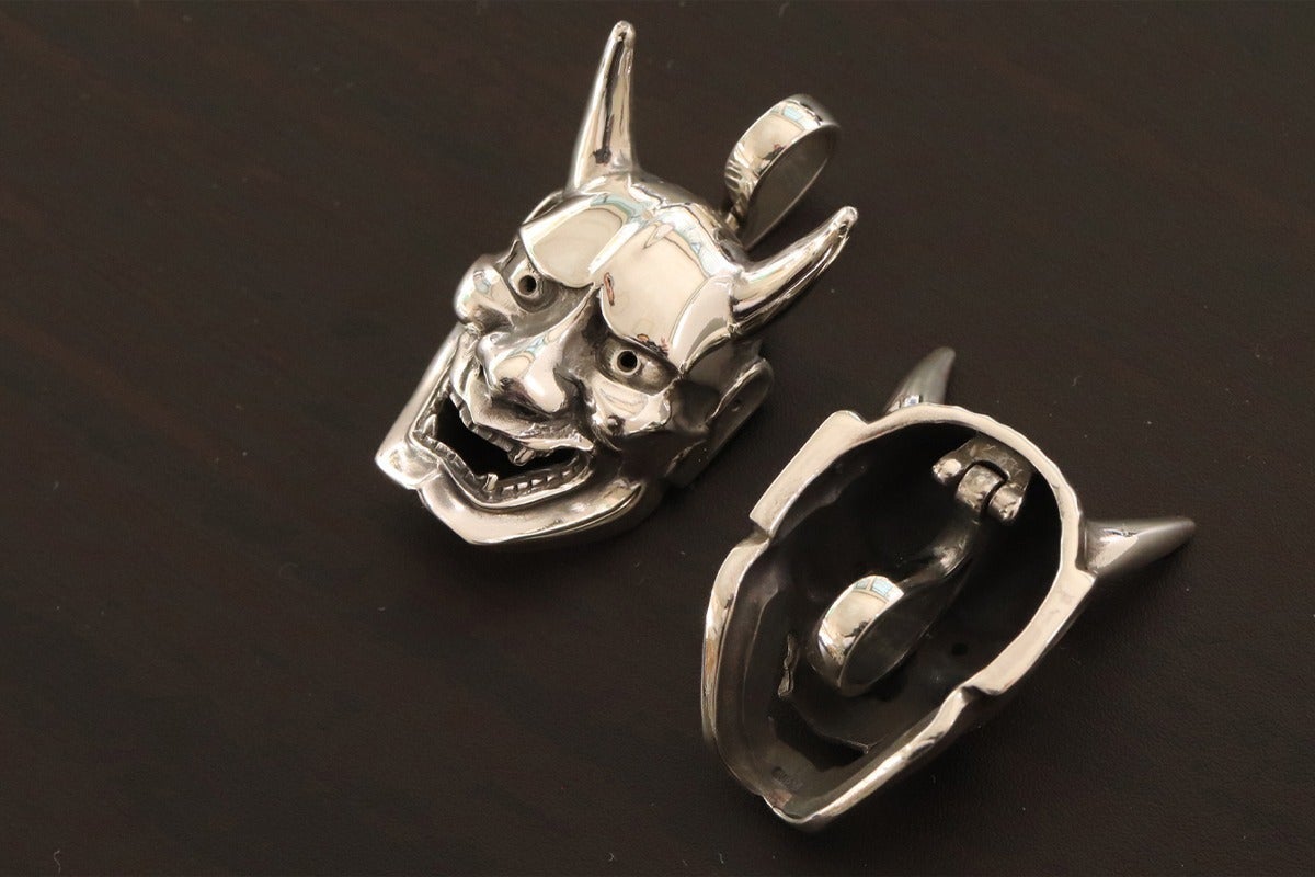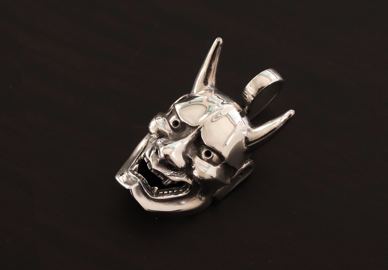 女の鬼を表現した般若の面には口の上下からキバが2本ずつ、額からツノが2本生えています。目を見開いて眉間にシワを寄せた嫉妬や恨みのこもる表情は、見るものを圧倒する恐ろしさがあります。