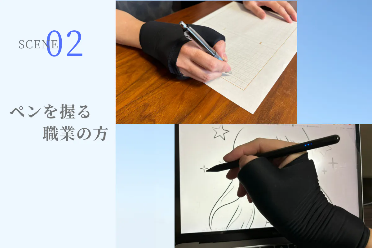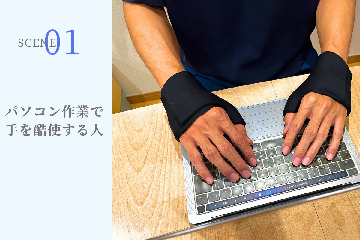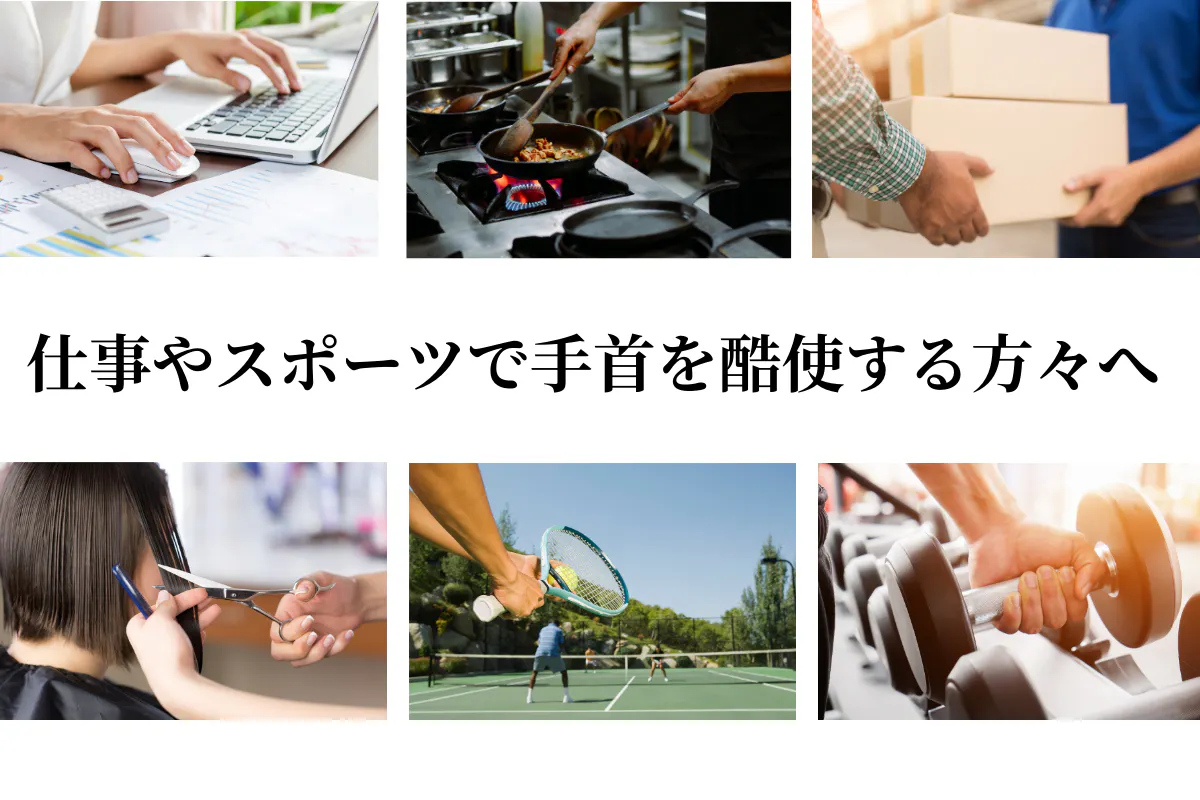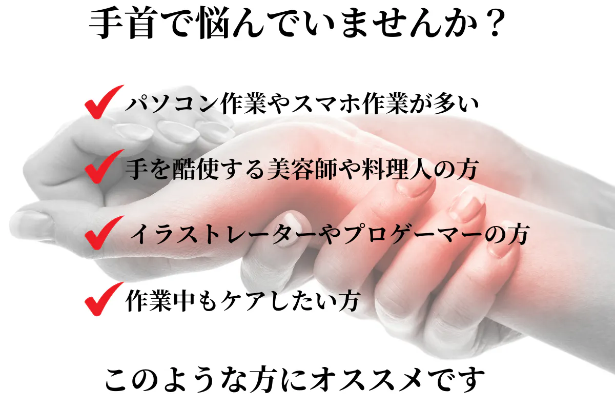 漫画家や、PCクリエイター、料理人、美容師といった毎日手を駆使する職業の方のみならず、スマホの使い過ぎで手首の痛みで悩む一般の方々にも適しています。
