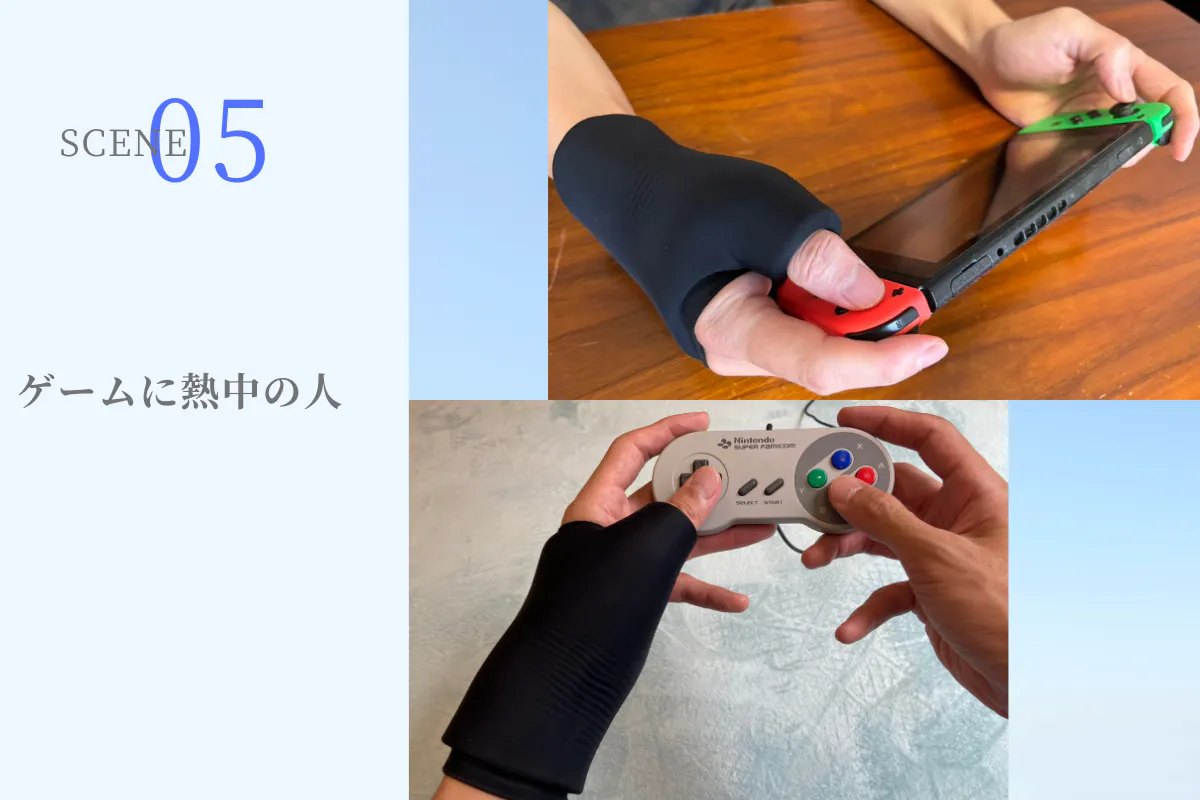 特に負担がかかりやすい手首と親指を包み込みます。