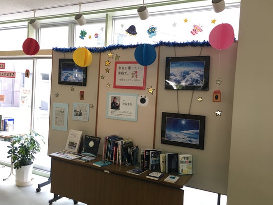 渥美図書館で表紙を正面にして陳列してあった岩谷さんの書籍「宇宙を撮りたい、風船で。」。