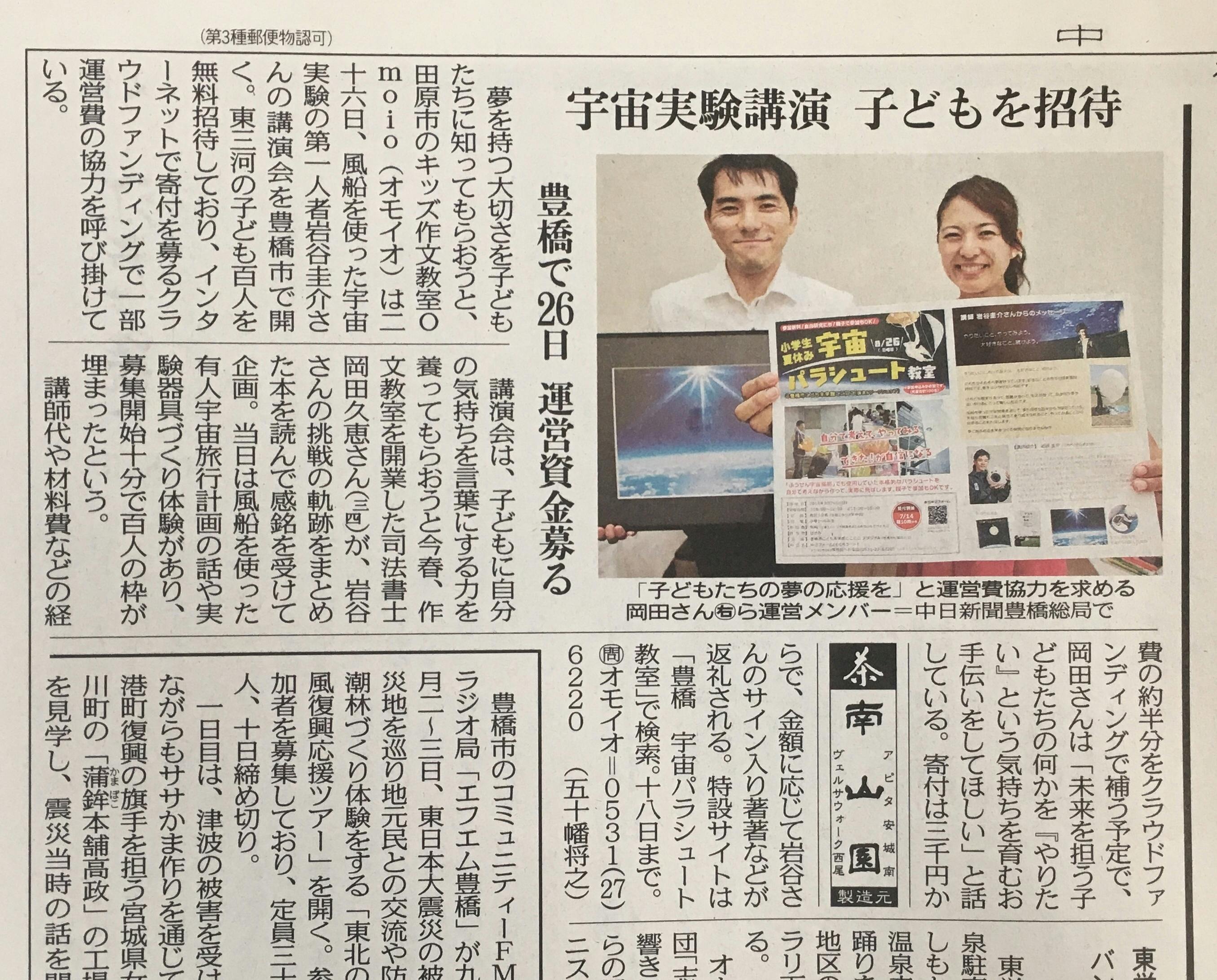 今朝の中日新聞朝刊の東三河版に、「宇宙パラシュート教室」の記事が掲載されました!