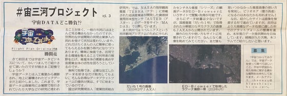 今日の東愛知新聞に、宇宙パラシュート教室に企画協力いただいているFlightPlanOriginalの勝間さんの連載記事が掲載されました! 勝間さんとお会いするたびに毎度違うお話が聞けるのですが、私が1番ワクワクするのは、この宇宙データの活用のことなんです。 衛星画像から得られる宇宙データを本当の意味で活用できるのは、地元の方たち。 たとえば、画像解析で温度分布がわかっても、それがなぜそうなるのか?は長い間そこで農業をしている地元の方の情報をもとにしないと分析できないとのことです。 そして地元の方の手による宇宙データの活用ができると、大企業からのトップダウンではなく、ボトムアップの産業が生まれるというお話。 そして、衛星画像を無料で取得でき、加工データを好きなだけ販売できるプラットフォームの提供がすでにはじまっているとのこと! 記事によると、こんなサイトがあります。 MADAS EOーBrowser JAXA(だいち1号の画像) このように資金力のある大企業でなくても、個人が安価または無償でさまざまなデータを使って発信したりサービス提供するということもまた、いろんな分野で可能になっていることです。 宇宙はとても遠く、私たちとは無関係に思えるかもしれません。 けれど宇宙データの活用という意味では、今の子どもたちが将来「宇宙」を舞台に仕事をすることはめずらしくなくなると思います。 自由な発想から生まれるもの、これからどんどん期待していきたいですね!