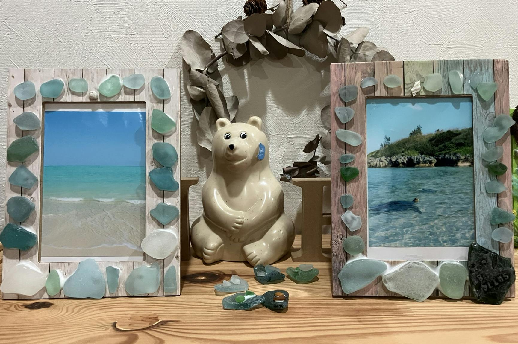 せっかくのヨロンのシーグラスなので、 ヨロンの写真をネットで探し、見つけたので印刷して飾りました。子供達は、こんなに綺麗な海があるのかと、びっくりしていました。いつか子供達を連れてヨロンへ行こうと約束しました。そして、こんな綺麗な海が繋がっていて、私たちの近くの海もあるのだということ。今度海に行き、ゴミ拾いしながらシーグラス探そうという話になりました。