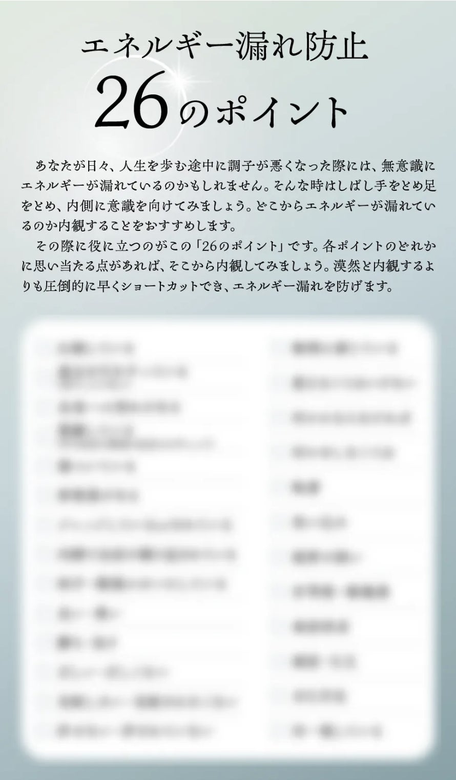 今回付録として提供しているこの「エネルギー漏れ防止26のポイント」は、私が今日までの間、心の学びをしてきた経験から、「どういう状態の時に心の苦しみが発生するのか」というポイントを凝縮したものとなります。この26のポイントを元に内側を見ていくことで、いち早く自身の内側で起こっているエネルギー漏れのポイントに気づくことができます。ぜひ日々活用いただけたら嬉しく思います。