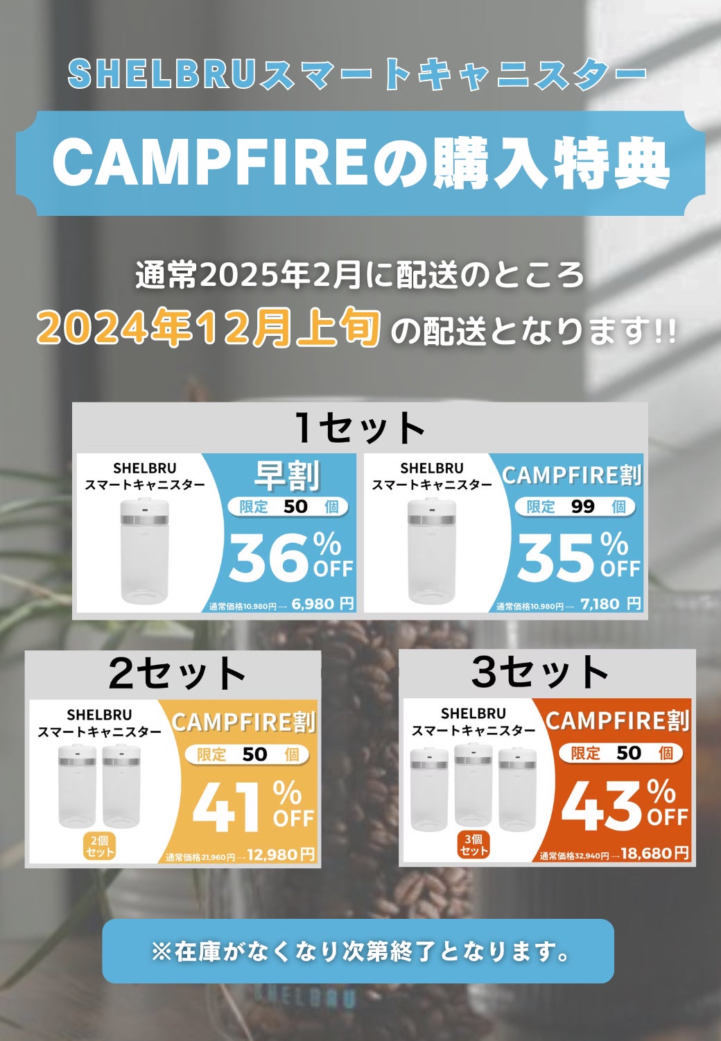 今回は【SHELBRUスマートキャニスター】プロジェクトへの『CAMPFIREの購入特典』を紹介させて頂きます!
