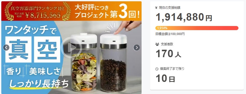 この度は「累計出荷数2万個◎ボタンを一度押すだけで自動真空。香りも美味しさもしっかり長持ち」に支援頂き、ありがとうございます!