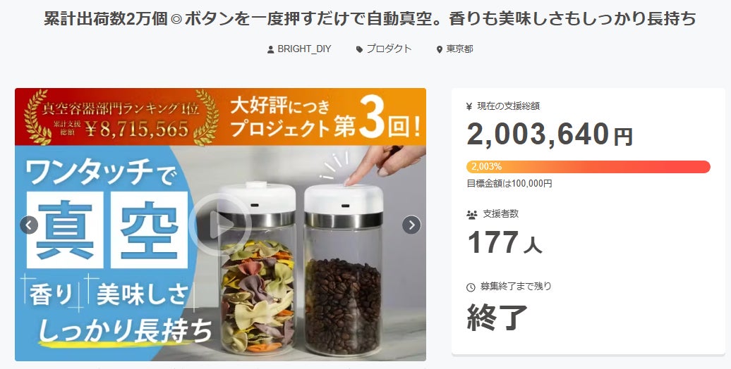 皆様にご満足いただけるリターンをお届けできるよう、全力で取り組んで参りますので引き続き、「累計出荷数2万個◎ボタンを一度押すだけで自動真空。香りも美味しさもしっかり長持ち」をよろしくお願い致します。