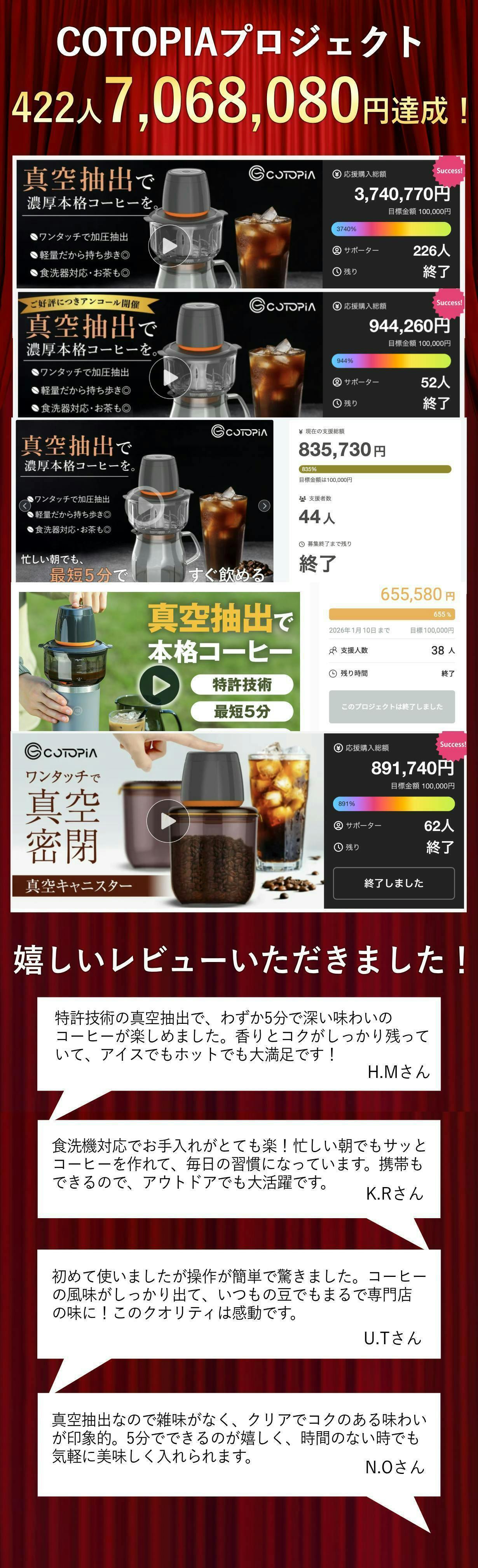 今回は皆さまに「特許技術による真空抽出で、最短5分で風味豊かなコールドブリューを作れるコーヒーメーカーとワンタッチで香りも鮮度も守る、次世代コーヒーキャニスター」プロジェクトを紹介させて頂きます。