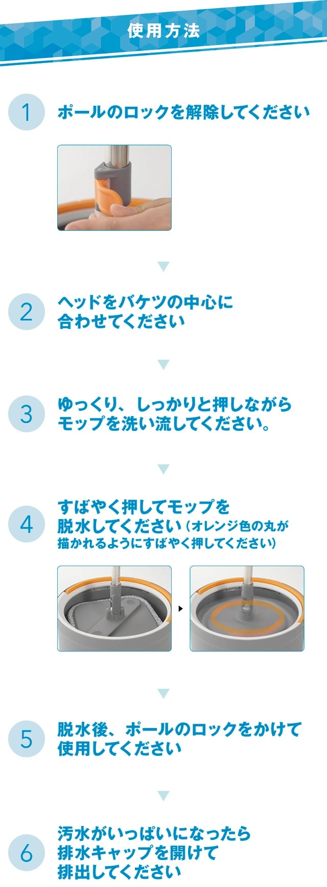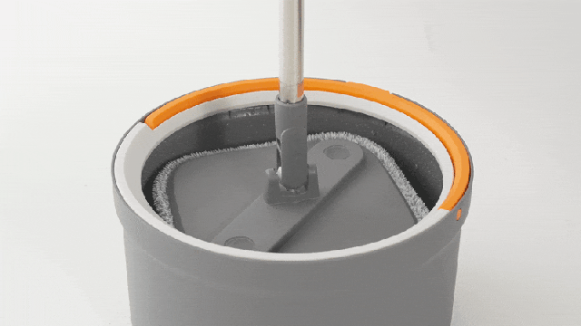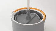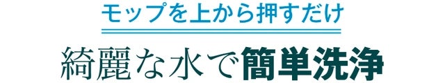 モップの中心をバケツの中央に合わせて上から押すことで、自動的にモップが回転します。その際、バケツ内から綺麗な水が噴射され、モップを清潔に保ちます。同時に、モップ自体の汚れは遠心力によってバケツの隅に溜まる仕組みになっており、常に清潔なモップを使い続けることができます。