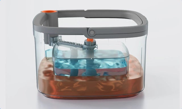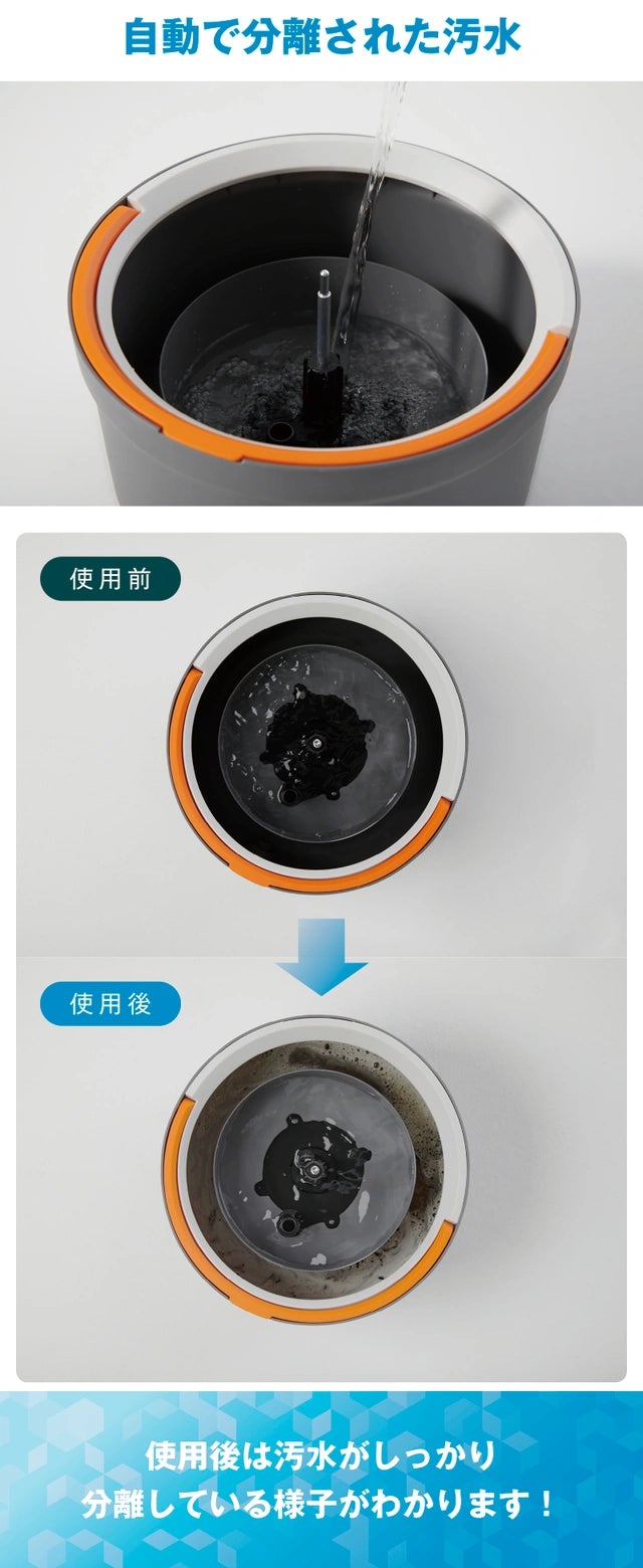 専用バケツと革新的な自動回転モップが組み合わさり、一気に効率的なお掃除を実現。綺麗な水でモップを清潔に保ちながら、汚れはバケツの隅に集まる画期的な仕組みです。(*上記写真は製品機能参考例です。)
