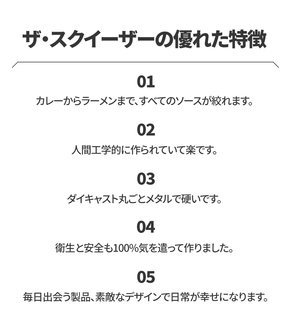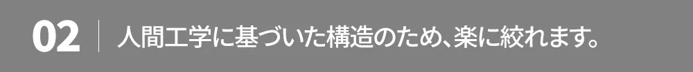 ザ・スクイ―ザーは手と手首を日常の動きの範囲で使えるように最適の曲げ角度を適用して作り上げた製品で、手に力を入れずにラクにお使い頂けます。