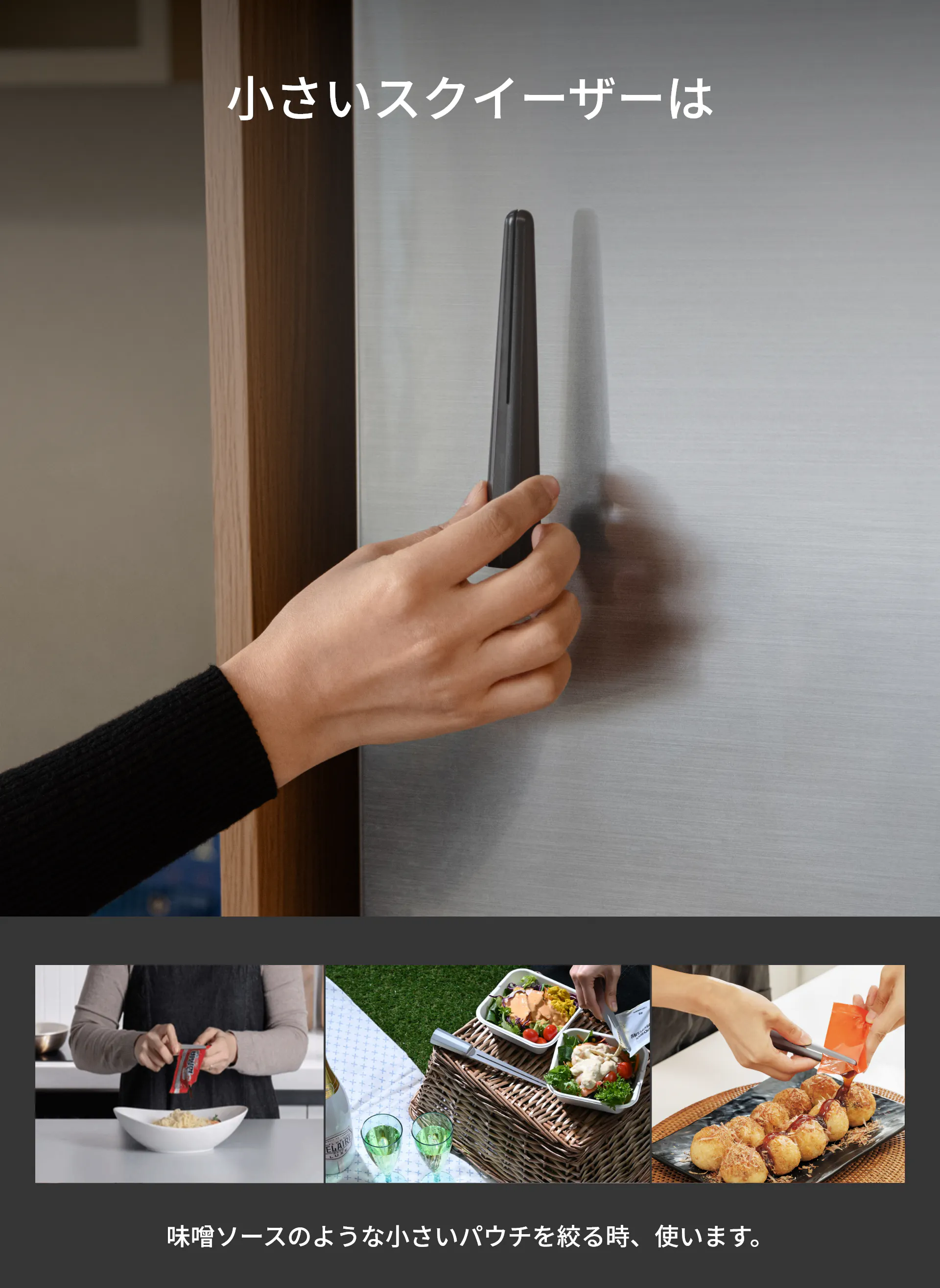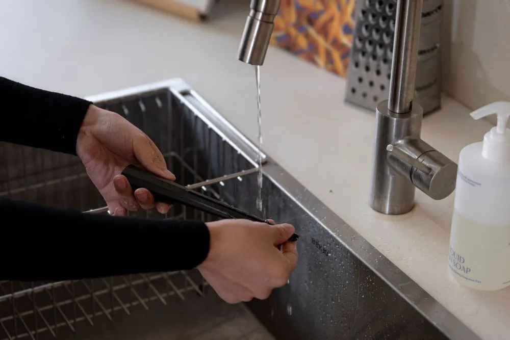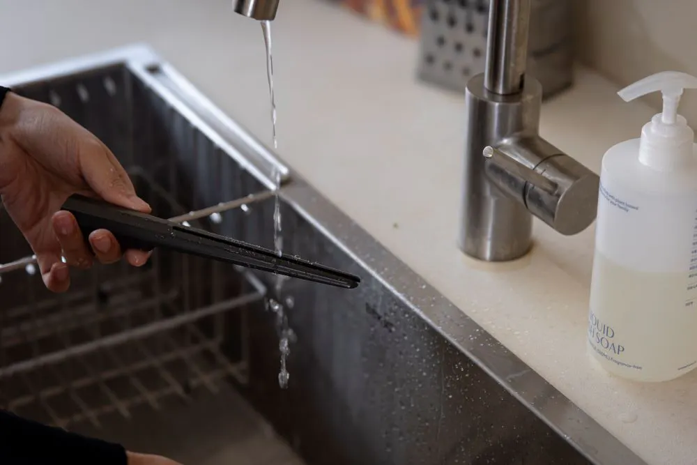 A2 : ザ・スクイーザーはお皿洗いがラクにできるように製品表面に処理を施していますので、お湯で流し洗いすると汚れが取れます。しかし、オイリーなソースを使用した場合は、台所用洗剤を使用して汚れを落とすことをお勧めします。使用後は、すぐに洗ってから柔らかい布で拭き、乾燥させてください。