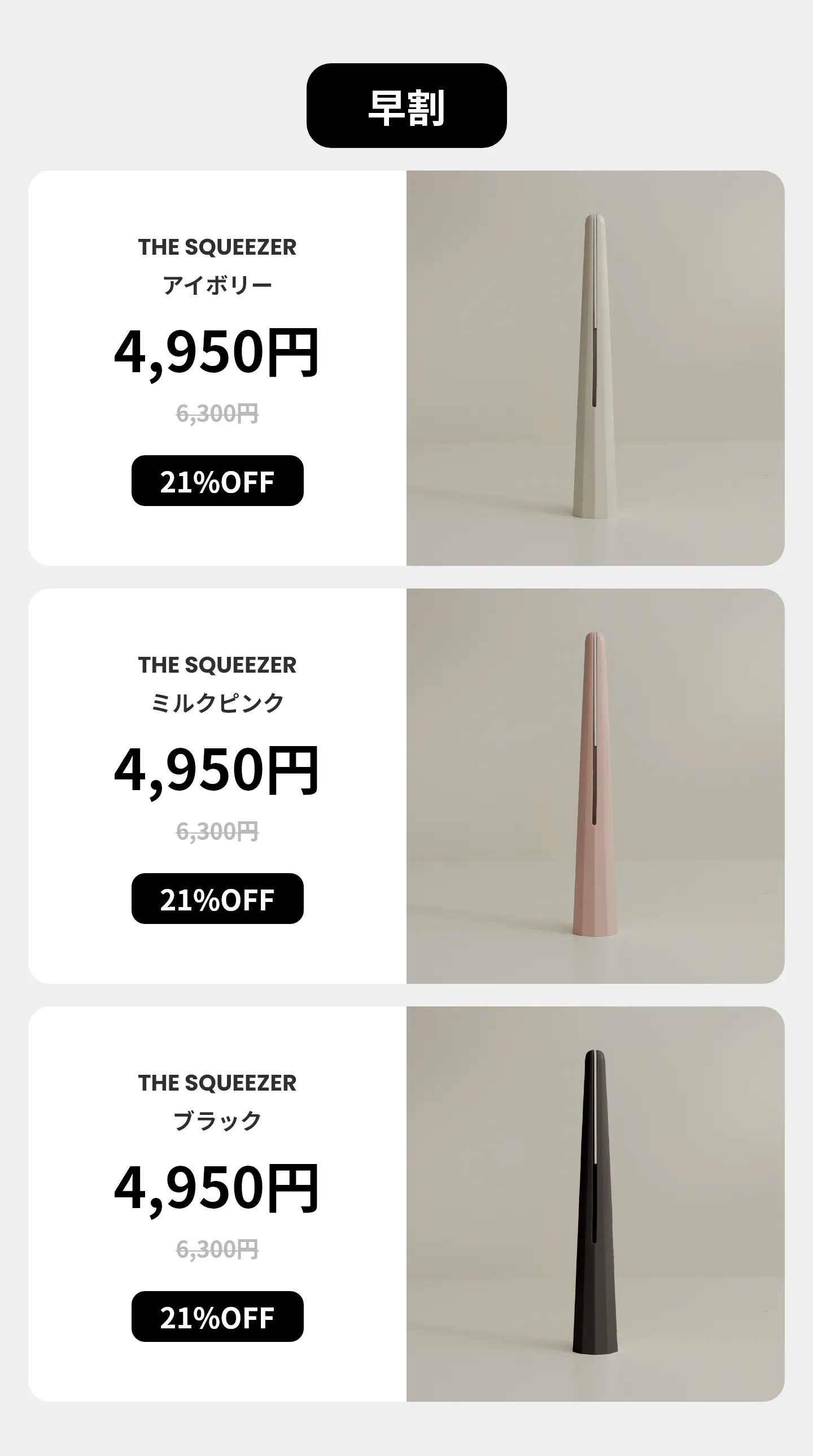 毎日使う枕の綿、毎日口をつけて飲むカップのデザインのように、小さなことですが「毎日出会い、大切な自分の日常を満たしてくれる製品で、毎日の幸せが倍になってたらいいな」と思いました。こんな気持ちを込めてデザインにもっと力を入れるようになりました。毎日使わなければならないから見るたびに幸せになるデザイン「ザ・スクイーザー」で、日常の小さな幸せをプレゼントしたいと思いました。
