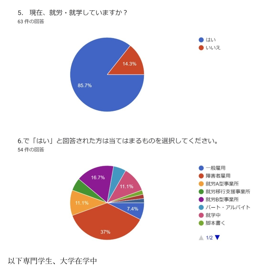 ソーシャルフットボール全国大会後(第4回、第5回)に出場選手を対象にしたアンケート集計結果を見ると、合計3割の選手が未就労・就労訓練中・B型作業所勤務(工賃の平均が1〜2万、厚生労働省より)となっています。