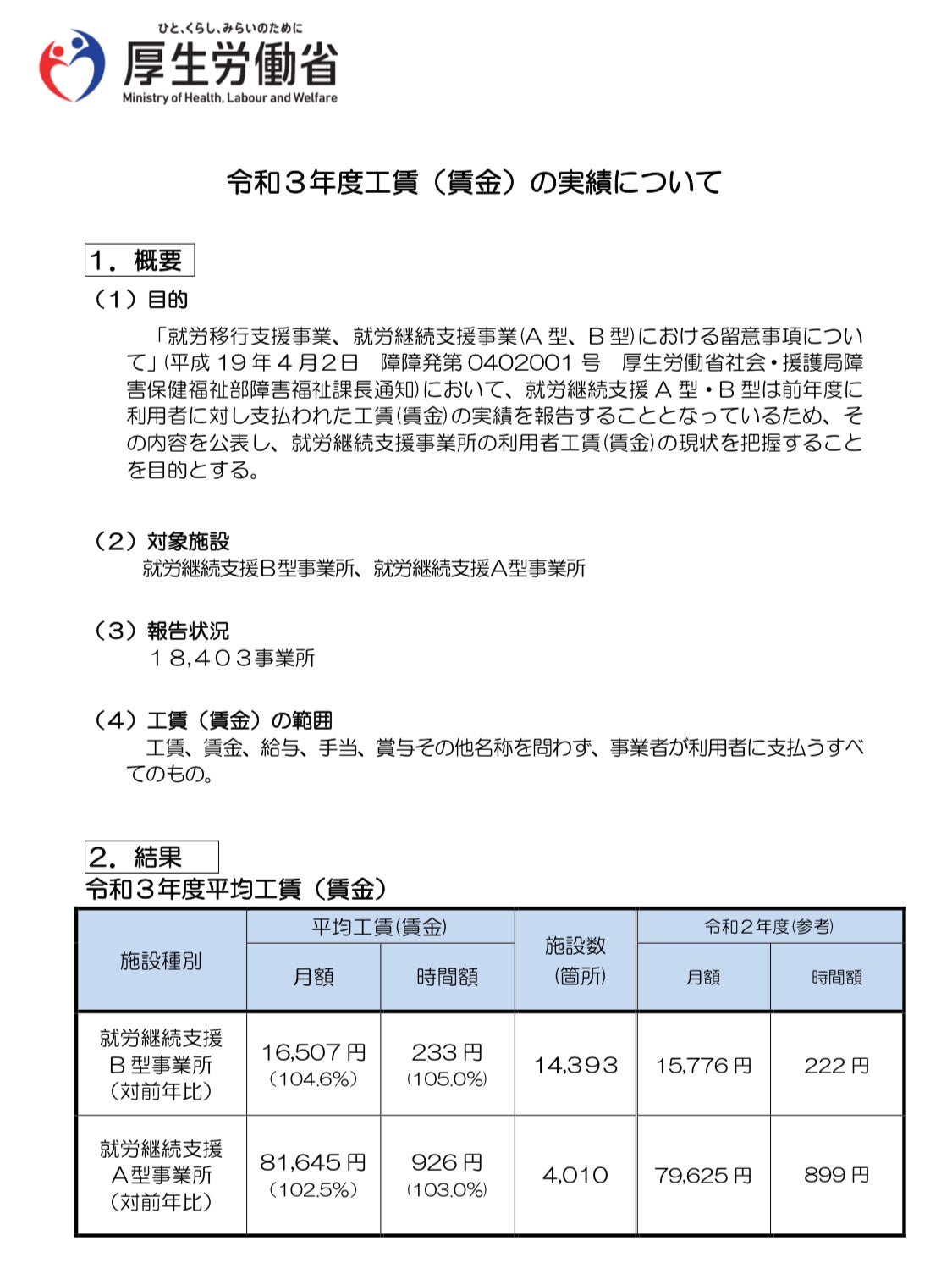 「厚生労働省 令和3年度工賃(賃金)の実績について」(1/6)より抜粋