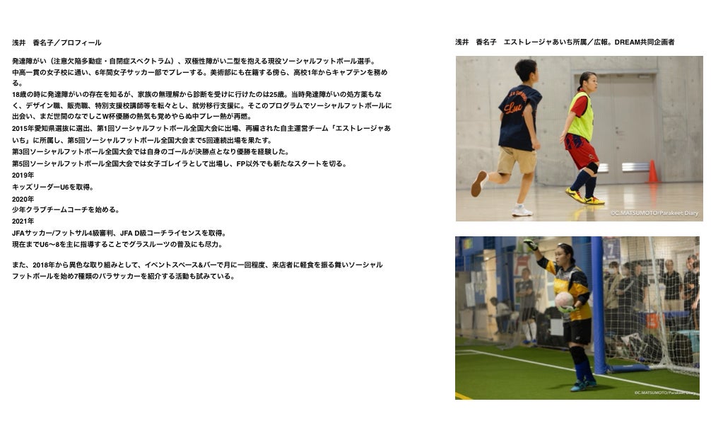 私、浅井香名子は、精神障がい・発達障がいを持つ方々が参加できるフットサル(ソーシャルフットボール)の選手を2012年から始めて12年になります。 ソーシャルフットボールは、càlcio socialeという、イタリアの分け隔てないインクルーシブなフットボールを起源とし、日本国内では、精神障がい者フットサルを指し、女性を含むと最大6名出場出来る特別ルールがあります。