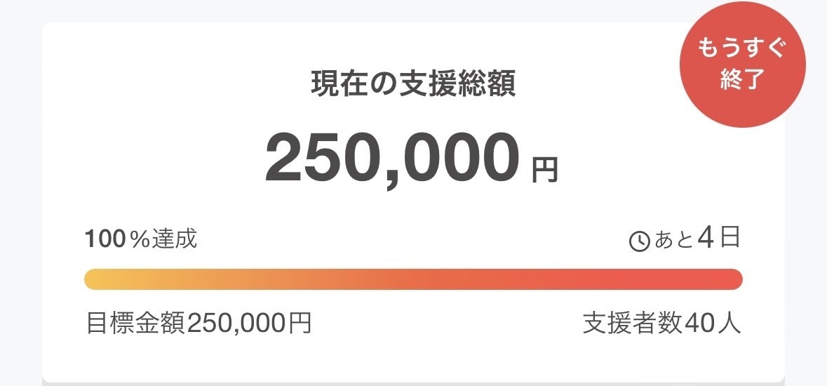 2024/09/01 10:21昨日、クラウドファンディング期間が終了しました。合計で286000円集めることができました。ご協力本当にありがとうございました。 もっと見るあと2時間
