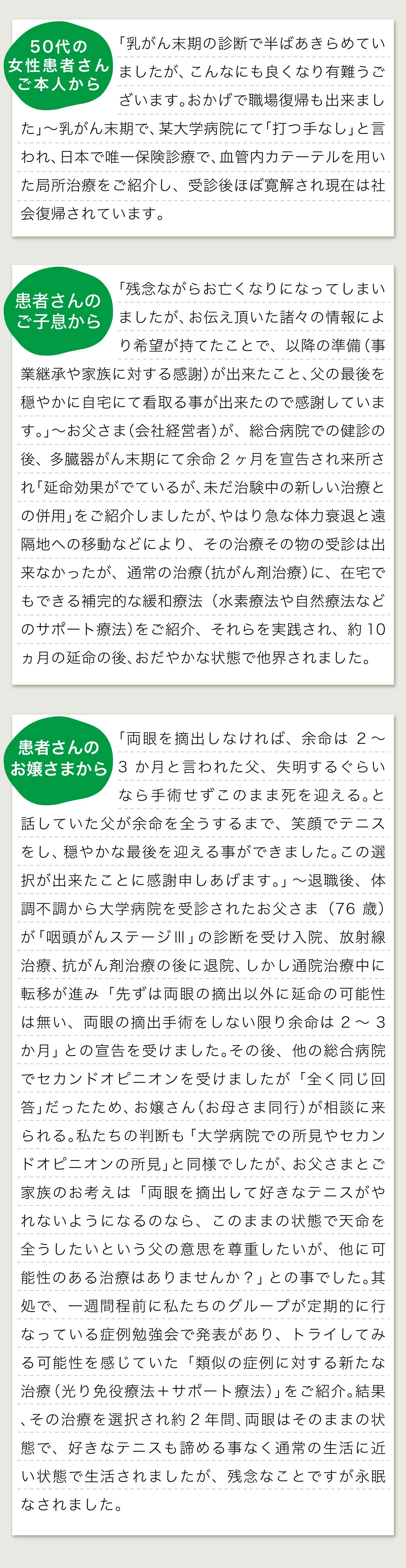 他の治療法を受けたら進行が止まったり、宣告されていた余命を大幅に超えて生きていらっしゃる患者さんもいる現実があります。